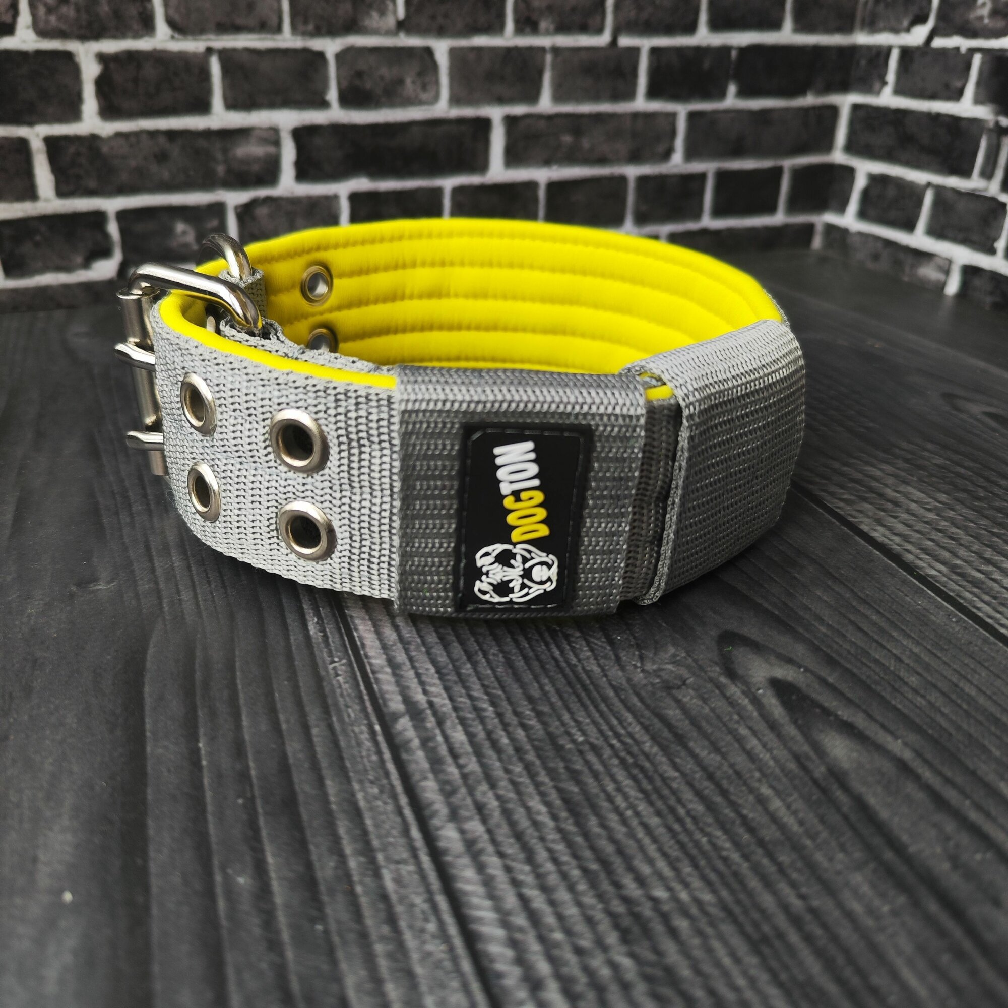 Купить Ошейник для средних собак с усиленной пряжкой широкий DOGTON. Ширина 5 см. Обхват 53-65 см. Цвет серый с желтым