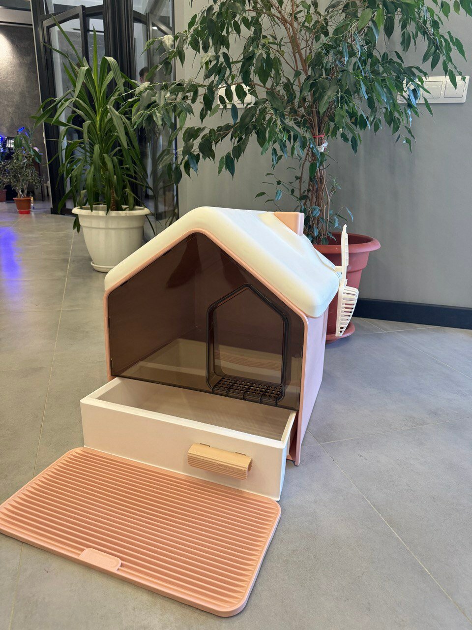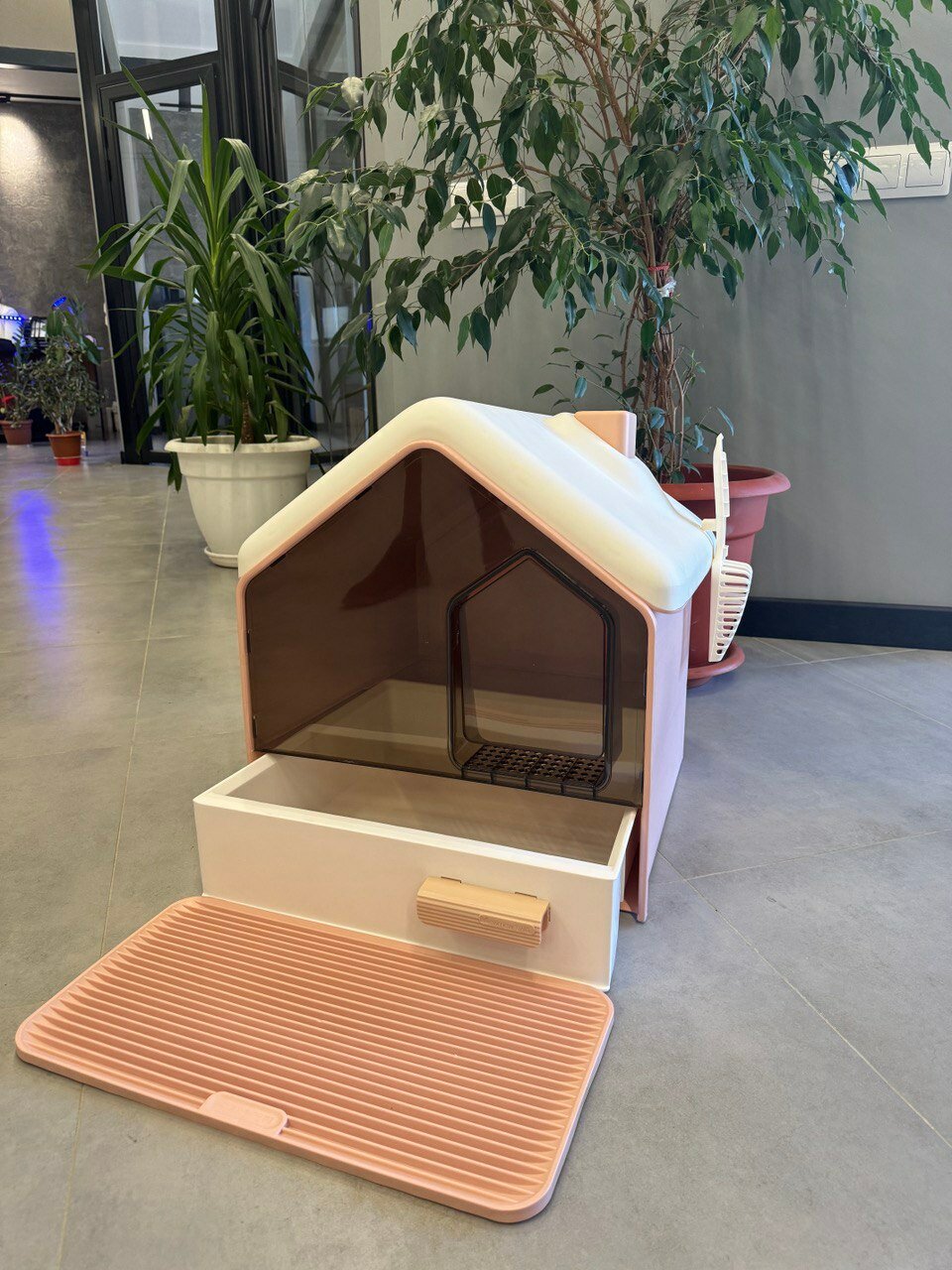СохранитьЗакрытый лоток-домик с выдвижным поддоном ,совком и украшением крыши «Чистый котик» " 48х46х51 см., розовый интересное: