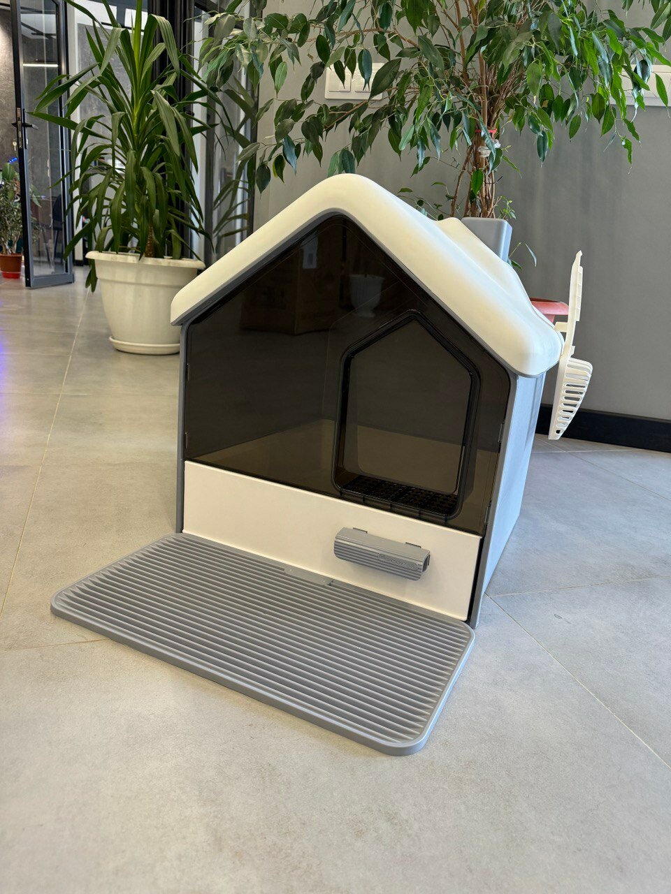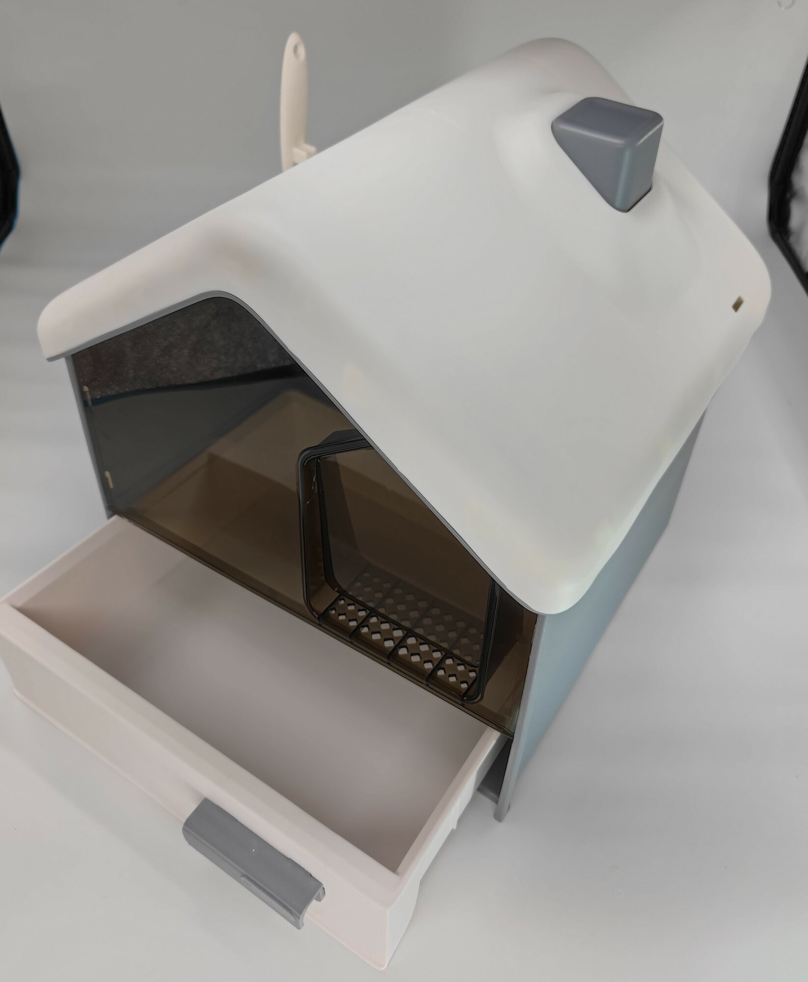 Закрытый лоток-домик с выдвижным поддоном и совком «Чистый котик» 41,5х45,5х45 см, серый