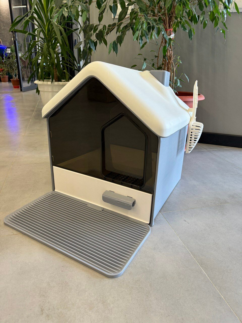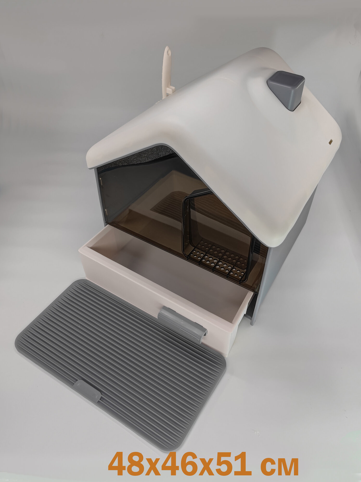 Купить Закрытый лоток-домик с выдвижным поддоном ,совком и украшением крыши «Чистый котик» " 48х46х51 см., серый