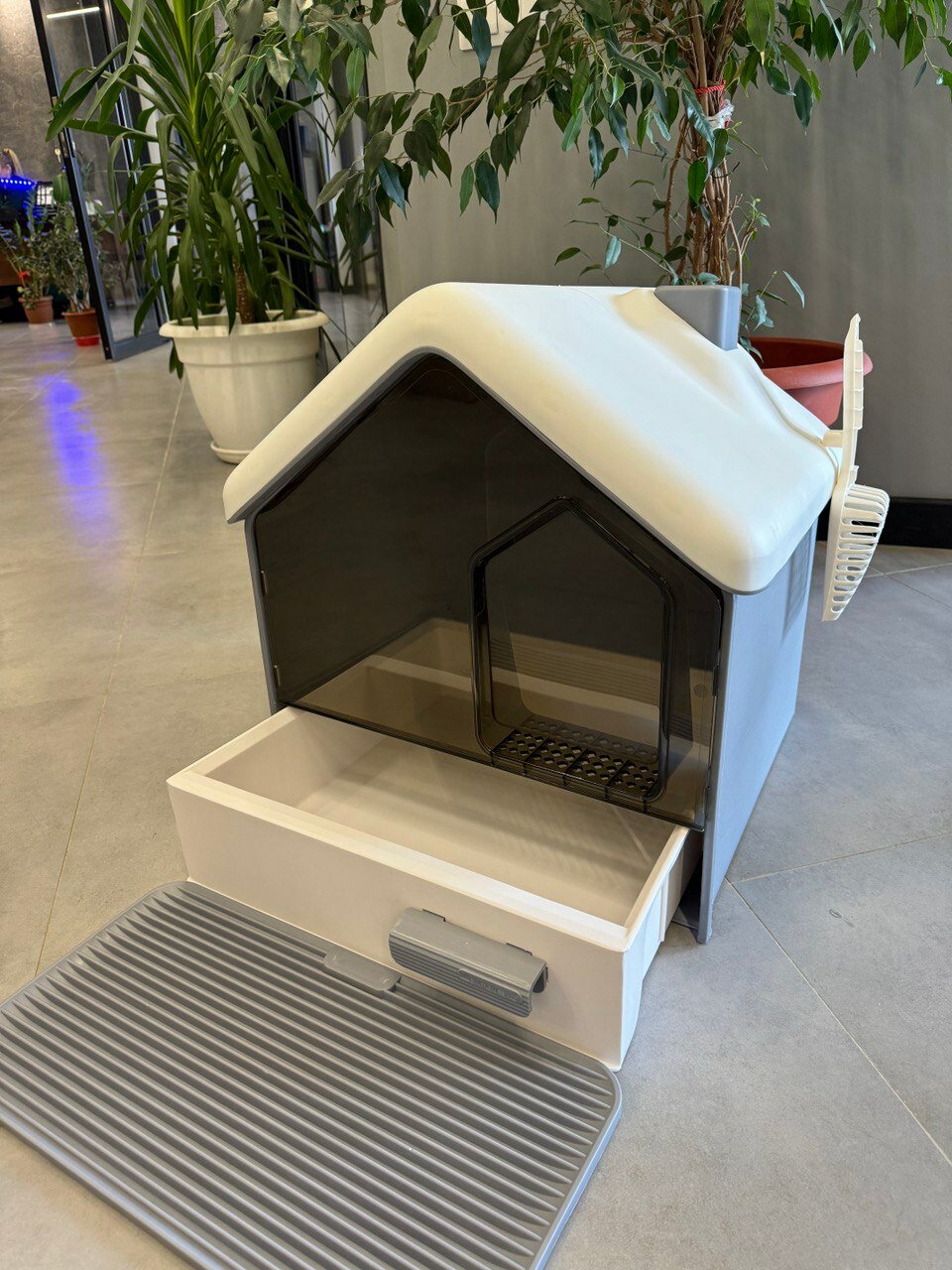 СохранитьЗакрытый лоток-домик с выдвижным поддоном ,совком и украшением крыши «Чистый котик» " 48х46х51 см., серый интересное: