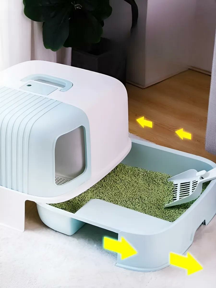 Закрытый лоток-туалет для кошек с откидной дверцей, угольным фильтром и совком "Чистый Котик" 50х40х41 см, синий