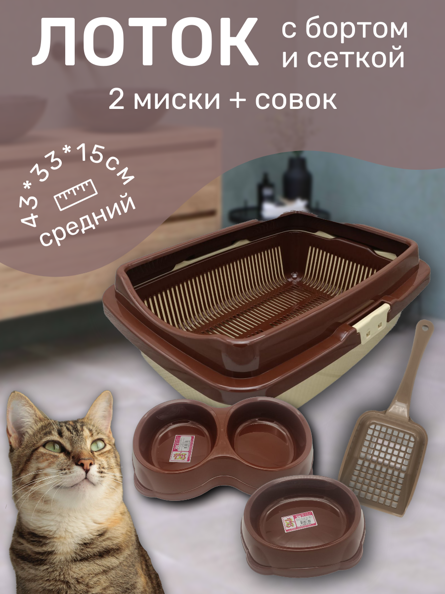 Купить Набор лоток с сеткой и бортом, с мисками и совком, лоток для кошек, туалет для кошек средний коричнево-бежевый