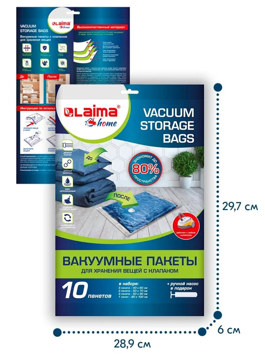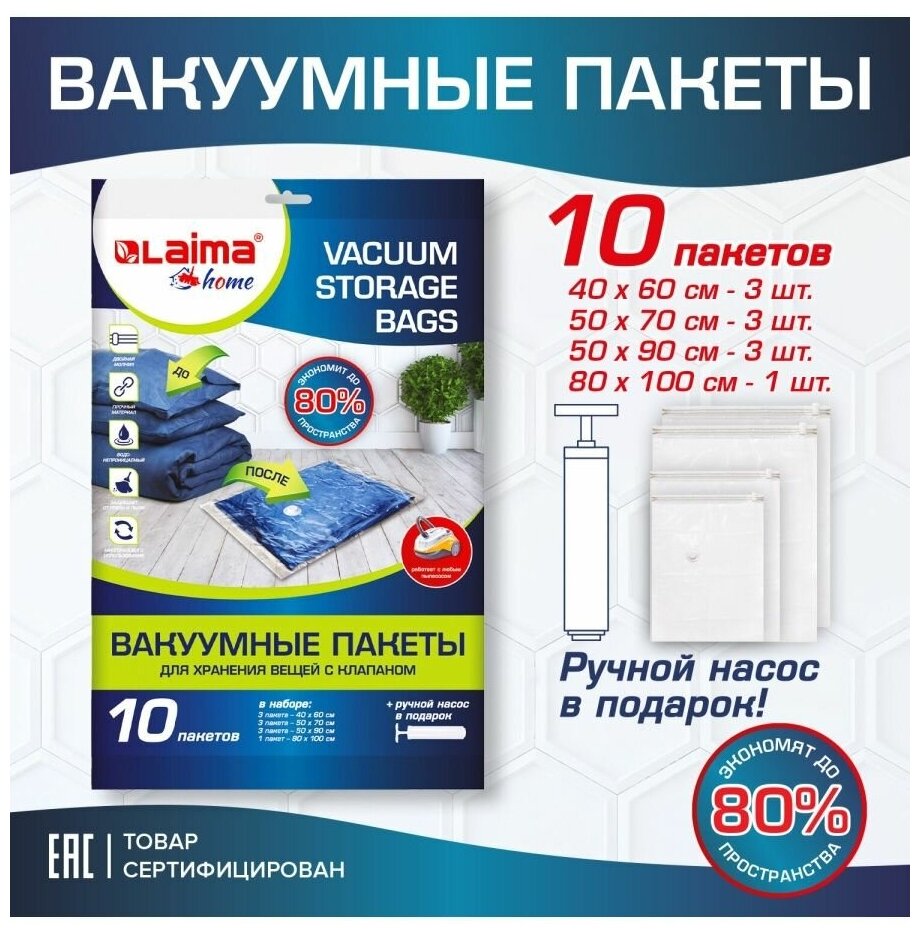 СохранитьВакуумные пакеты с клапаном для хранения вещей комплект 10шт, насос в комплекте, LAIMA HOME, 607914 интересное: