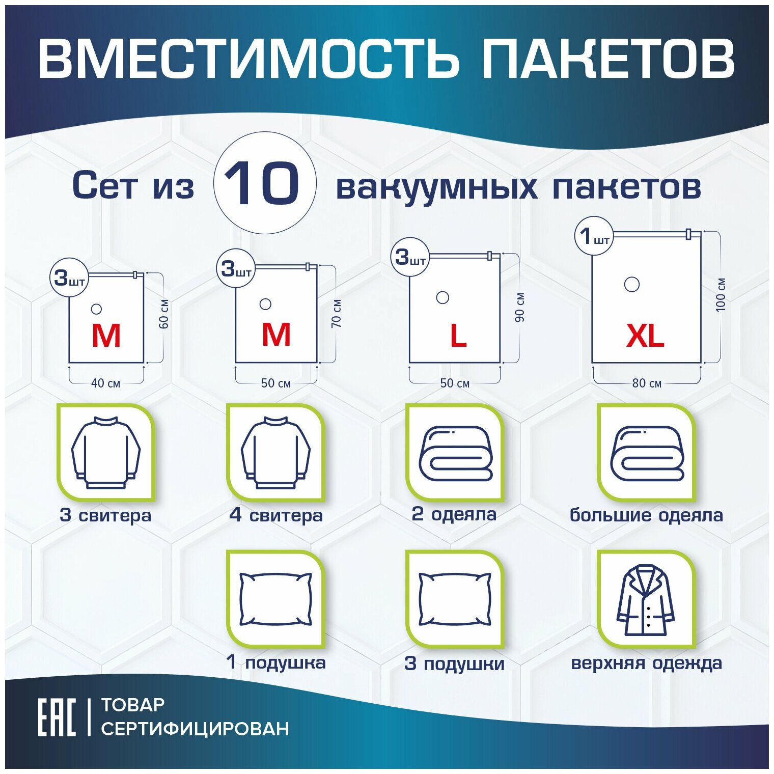 Пакеты / мешки вакуумные для хранения одежды / вещей / обуви с клапаном для пылесоса и насоса Комплект 10 шт., Насос в комплекте, Laima Home, 607914