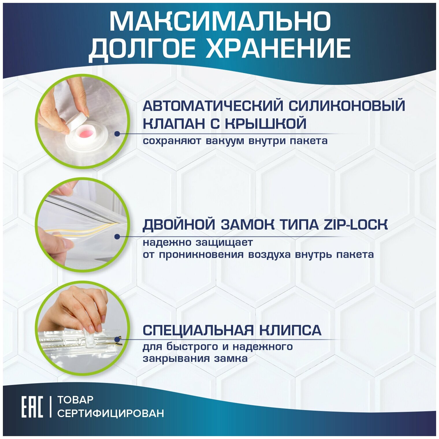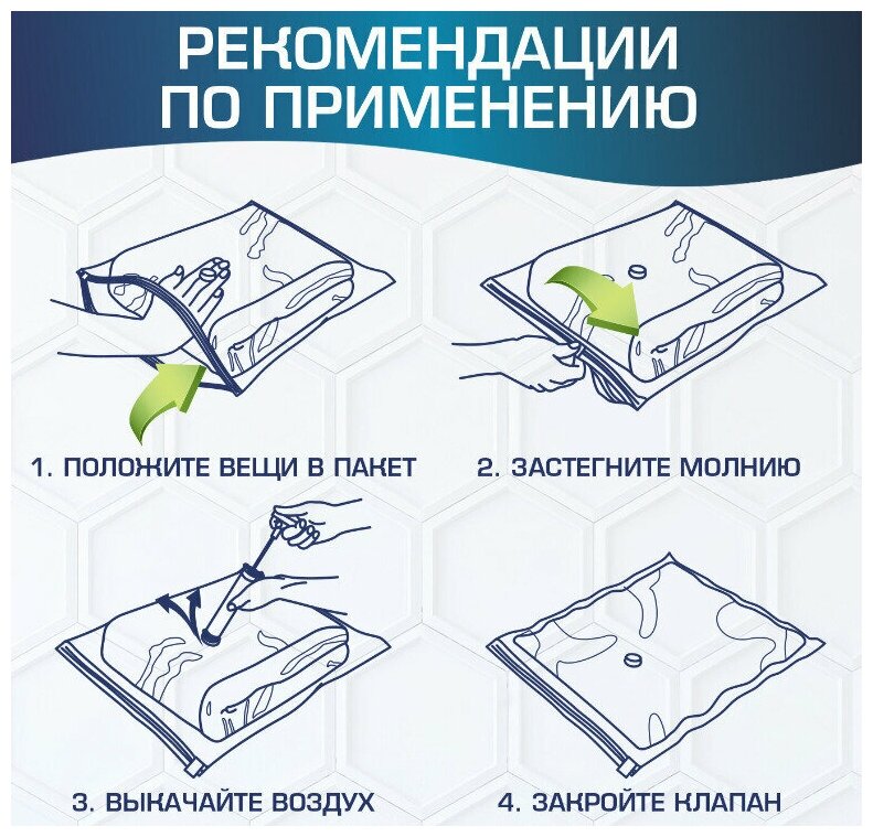 | Дополнительная информация | В комплект входят 8 пакетов: 3 пакета 50 х 60 см, 2 пакета 60 х 80 см, 3 пакета 70 х 100 см и ручной насос |