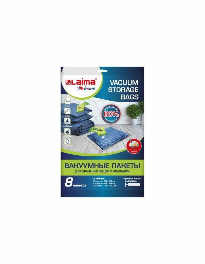 Купить Вакуумные пакеты с клапаном для хранения вещей комплект 8шт, насос в комлекте, LAIMA, 607787