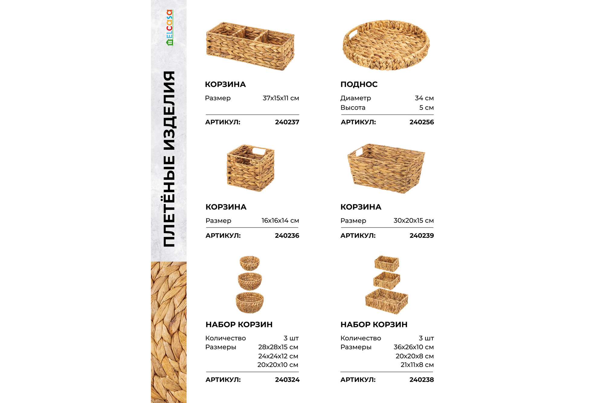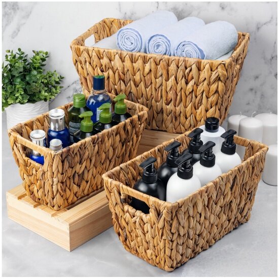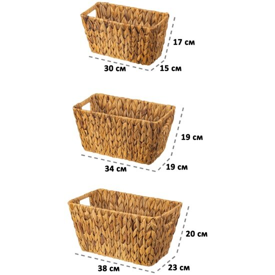 | Дополнительная информация | Набор 3 плетеных корзинок 38*23*20 см с ручками, 1 корзинка - 38*23*20 см, 1 корзинка - 34*19*19 см, 1 корзинка - 30*15*17 см |