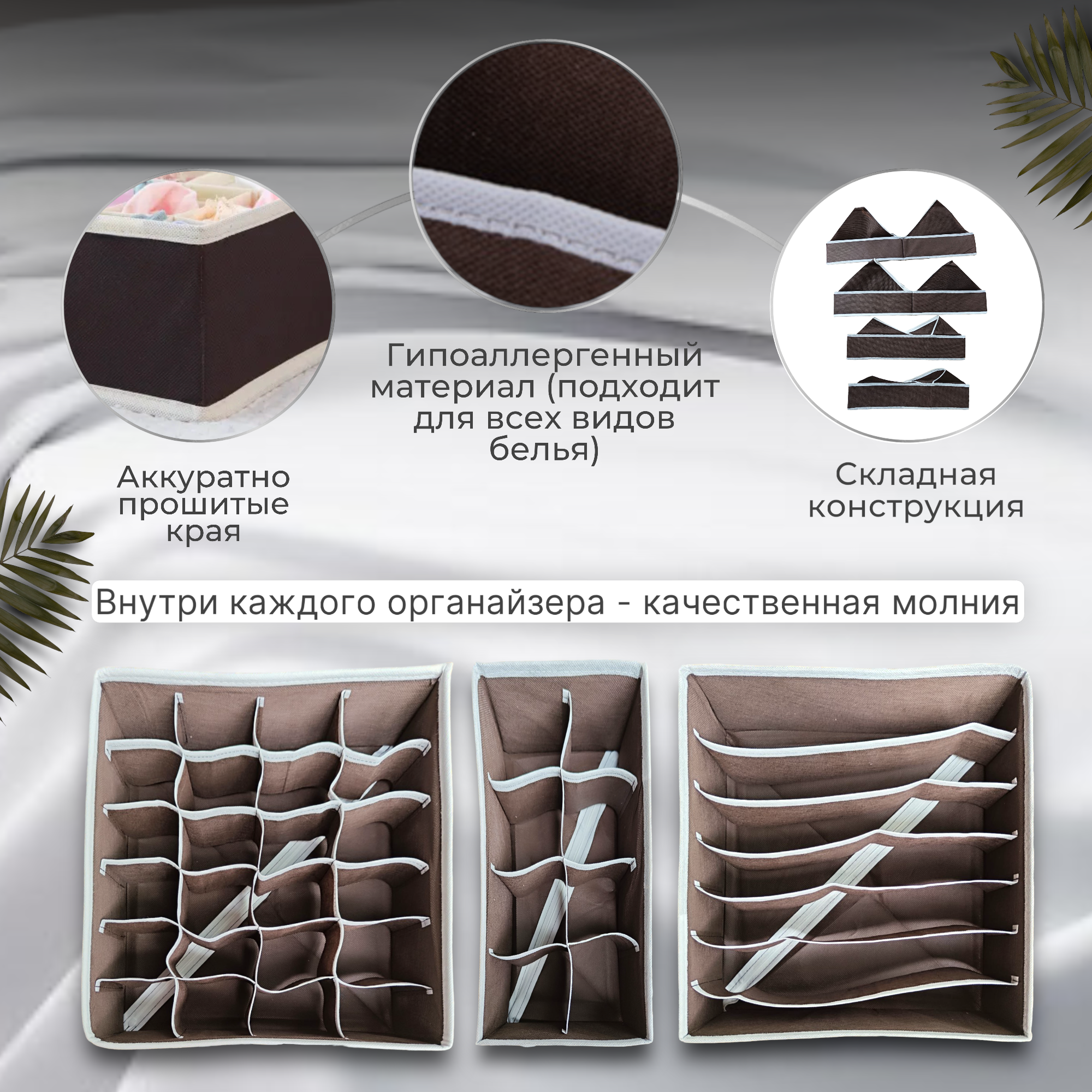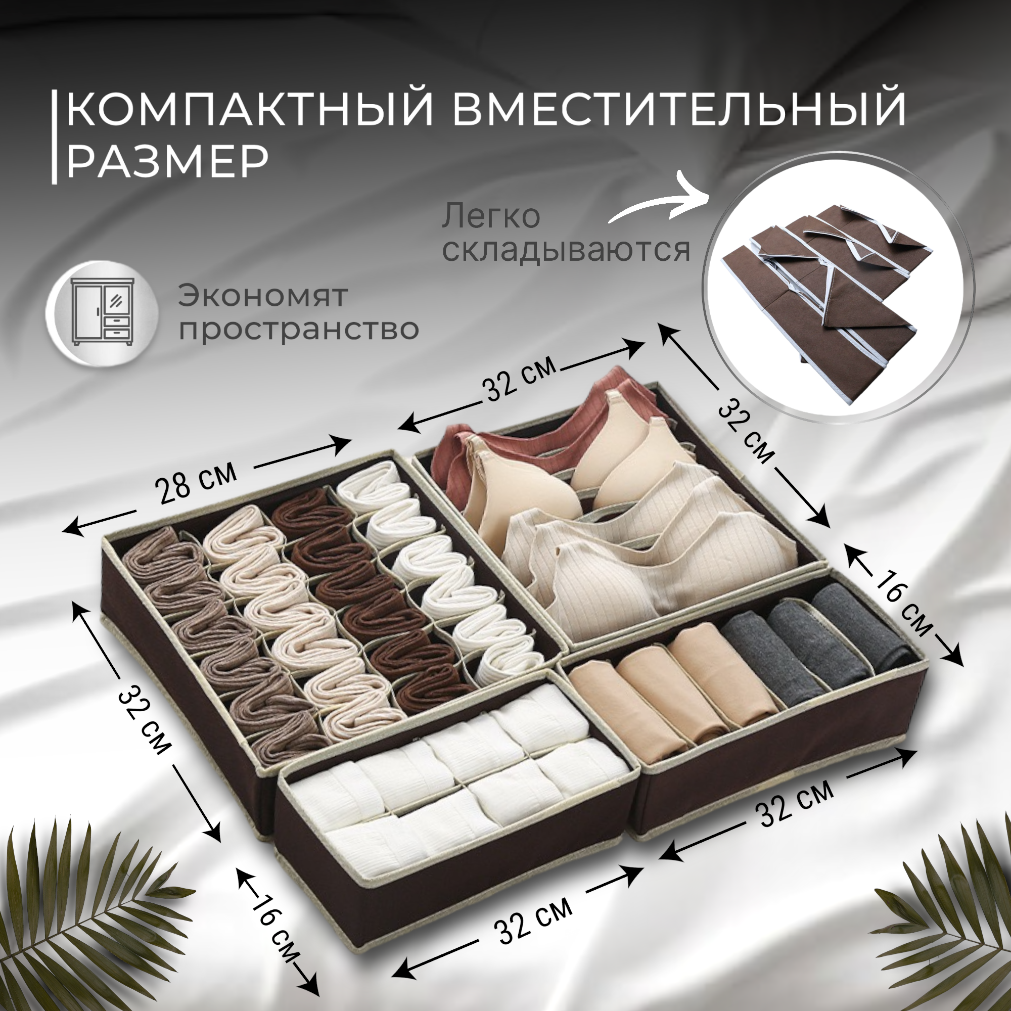 | Комплектация | Кофр для бюстгальтеров 7 ячеек - 1 шт 32х32х9,5см Кофр для носков и галстуков 8 ячеек - 1 шт 32х16х9,5 см Кофр для нижнего белья 24 ячейки - 1 шт 32х32х9,5 см Кофр для шарфов 6 ячеек - 1 шт 32х16х9,5 см |