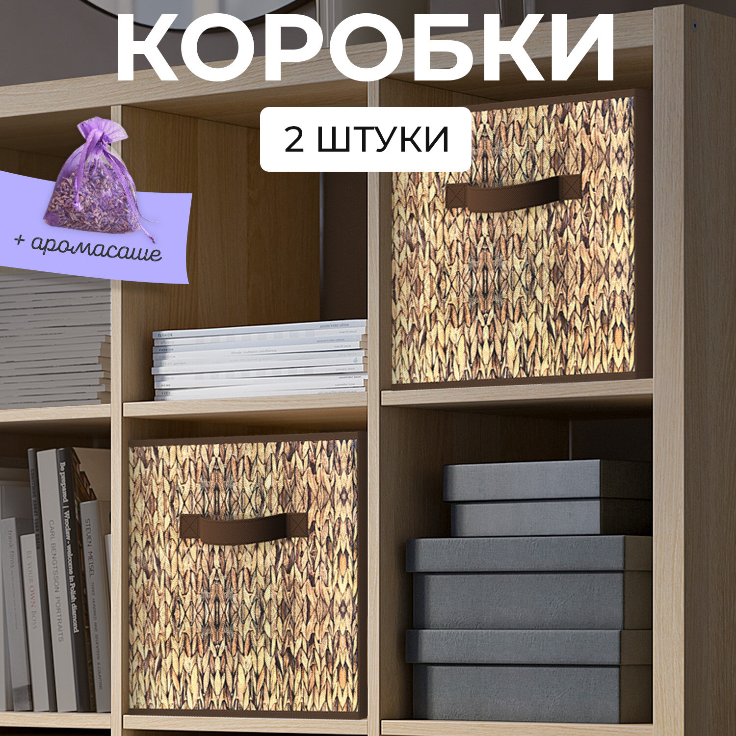 Коробки для хранения вещей, короб для хранения стеллажный, корзина, ящик, набор 2 шт., 27*27*28 см, темно-бежевый/коричневый, BASIC
