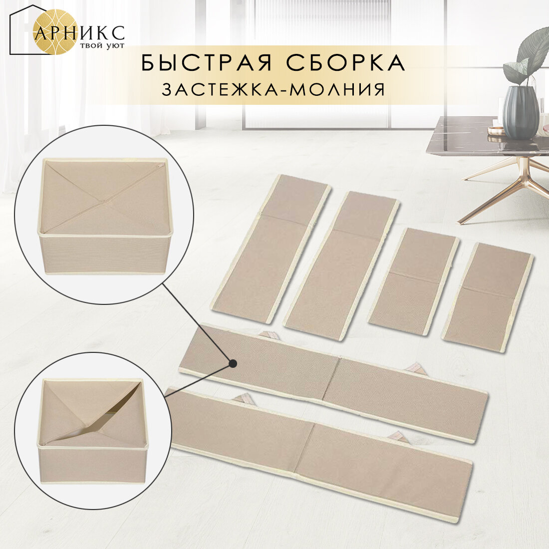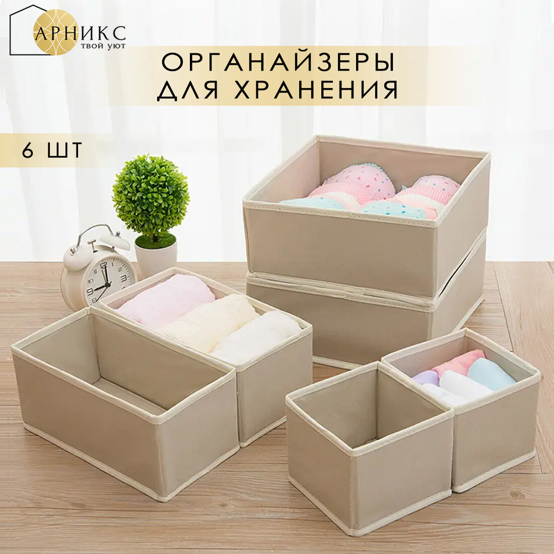 Купить Органайзер Арникс для хранения вещей и одежды, складной, с разделителями/ Кофр для бюстгальтеров, нижнего белья и носков/ Набор 6 шт/ Бежевый