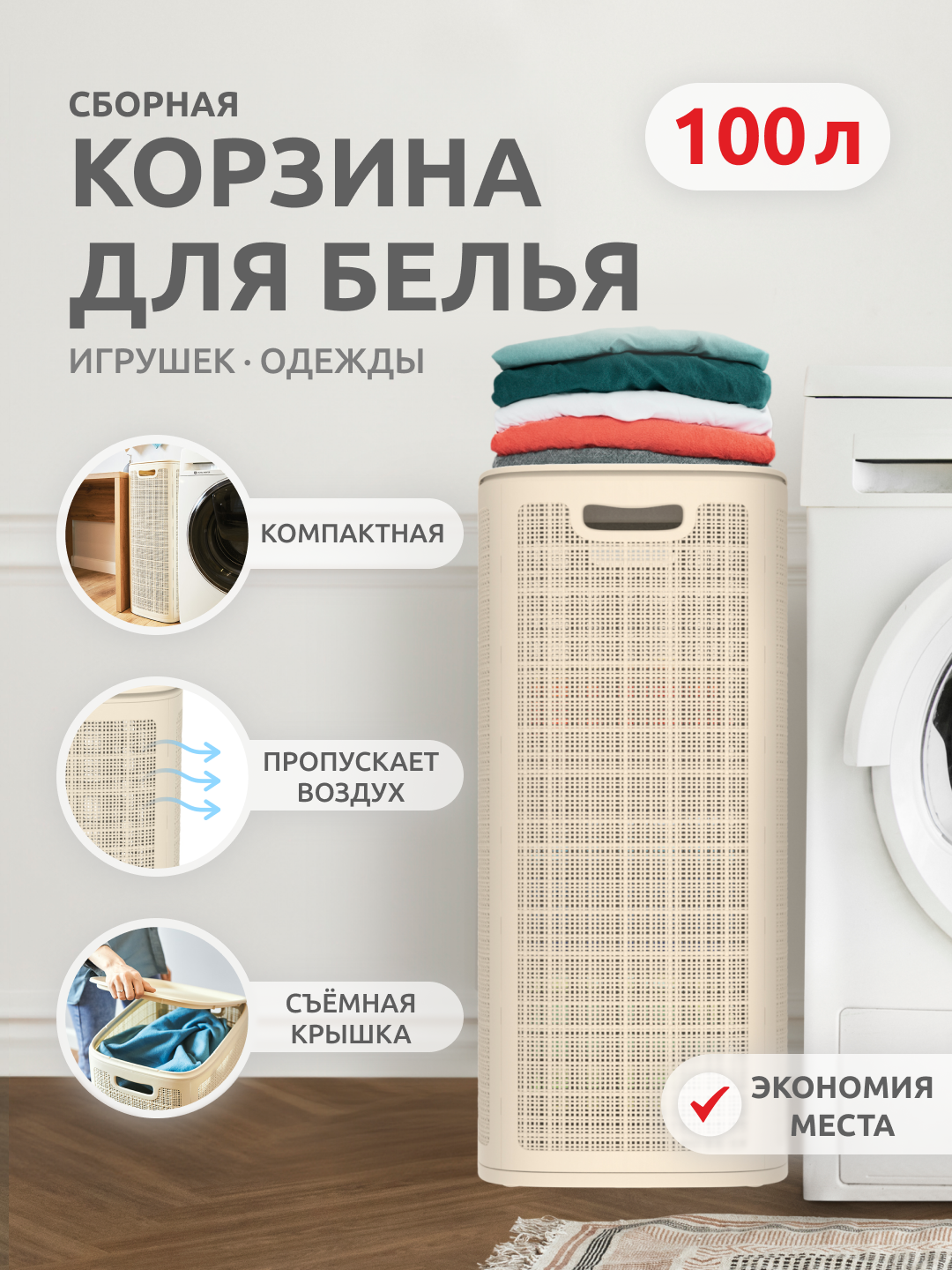 Корзина для белья «Лён», 100л, слоновая кость, Альт-Пласт, сборная, полипропилен