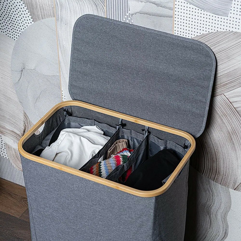 Корзина для белья с крышкой в ванную из водонепроницаемой ткани и складным каркасом из бамбука