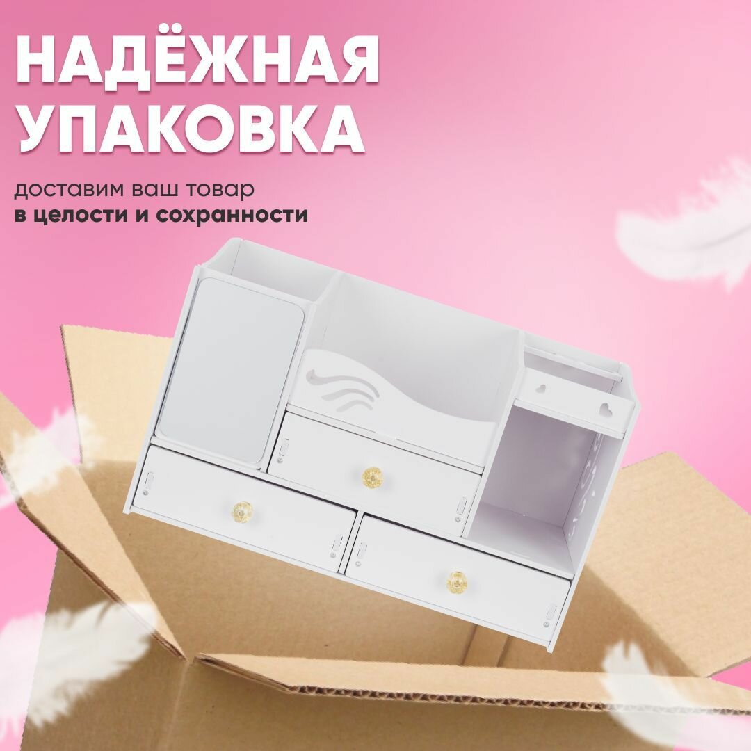 Органайзер для косметики с зеркалом OQQI, 3 секции, с выдвижным ящиком
