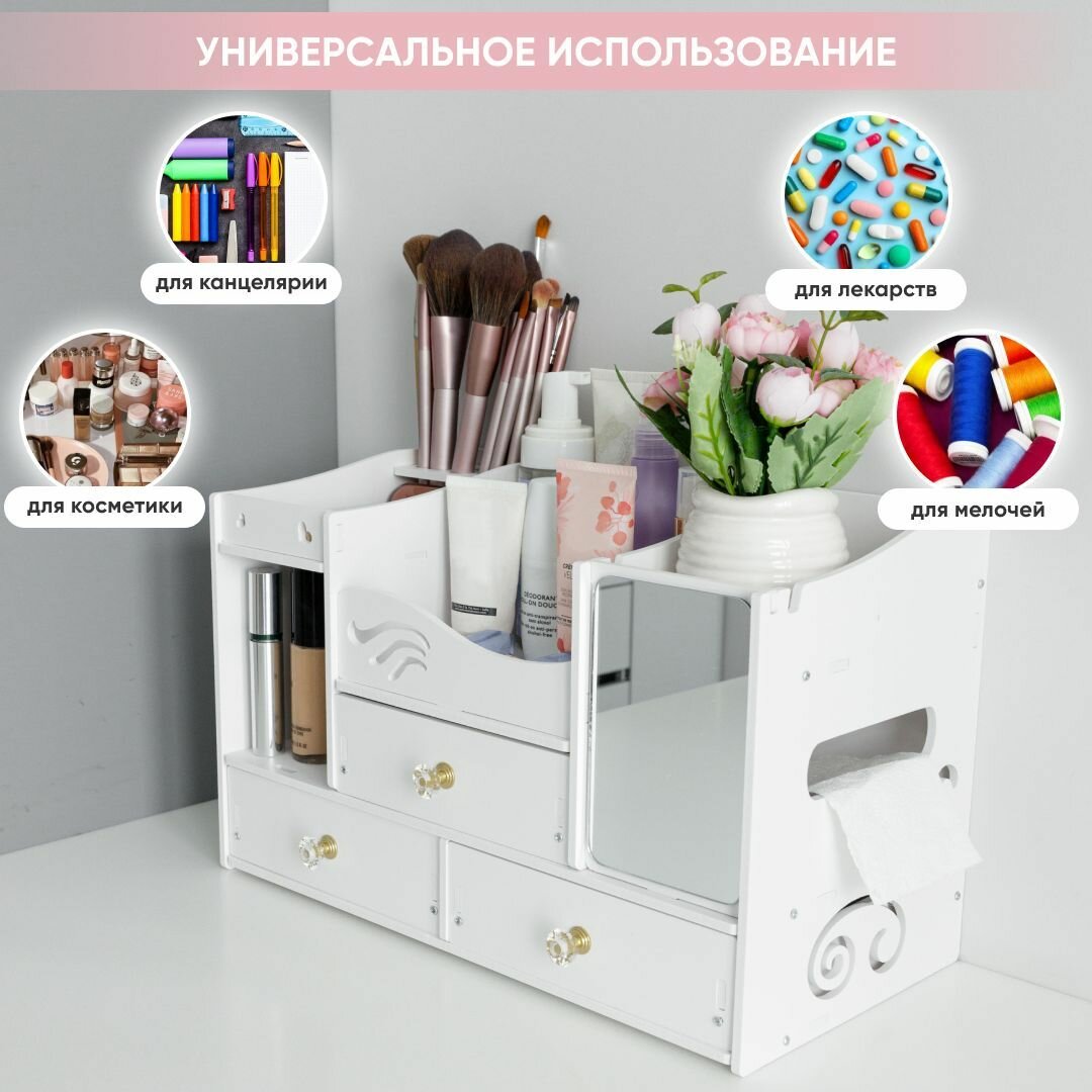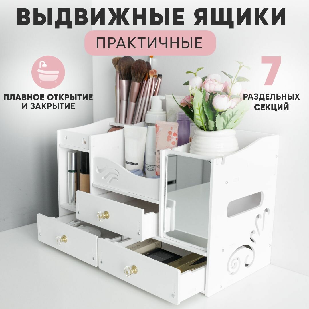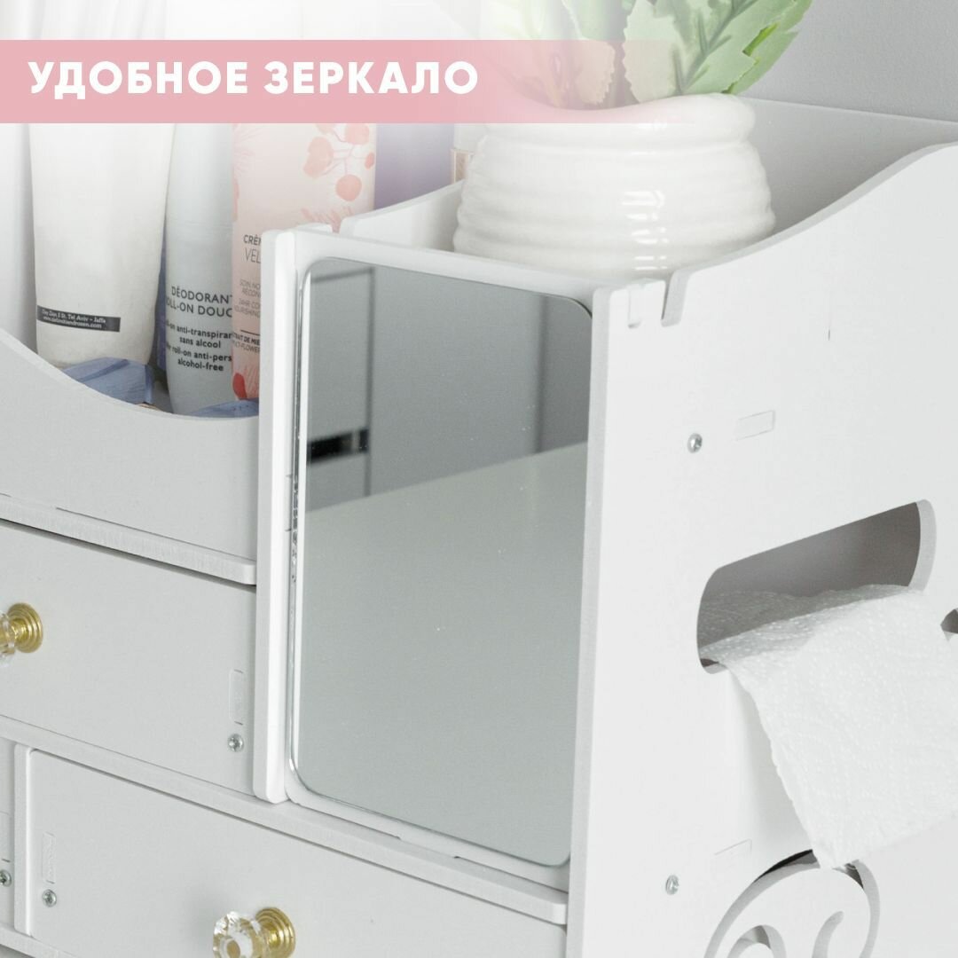 Органайзер для косметики с зеркалом Oqqi, большой, 8 секций, с выдвижными ящиками, отделение для салфеток, 20х25х40 см, белый