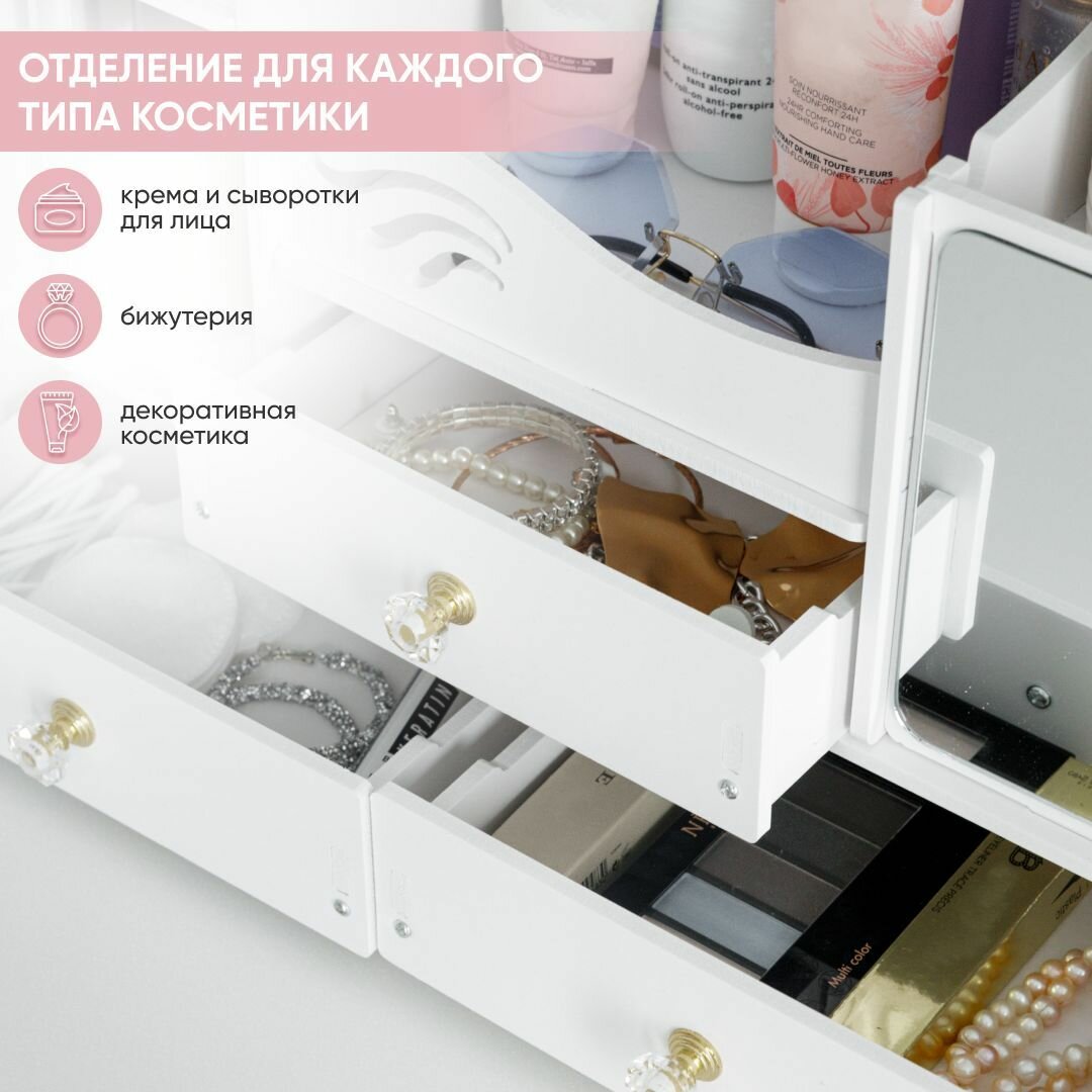 Органайзер для косметики с зеркалом Oqqi, большой, 5 секций, с выдвижными ящиками, 41х20х34,5 см, белый
