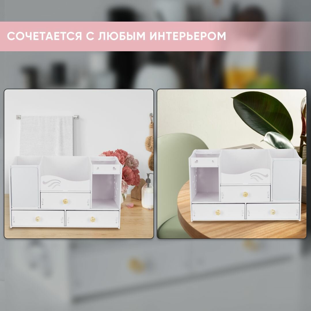 Органайзер для косметики большой Oqqi, с выдвижными ящиками, 5 секций, 34х20х30 см, белый