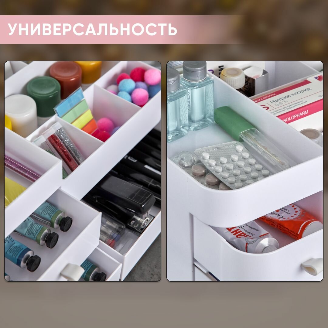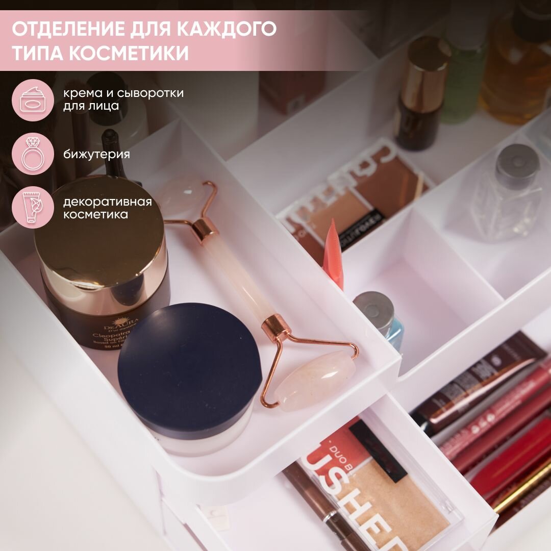 Органайзер для косметики с зеркалом OQQI, 3 секции, с выдвижным ящиком