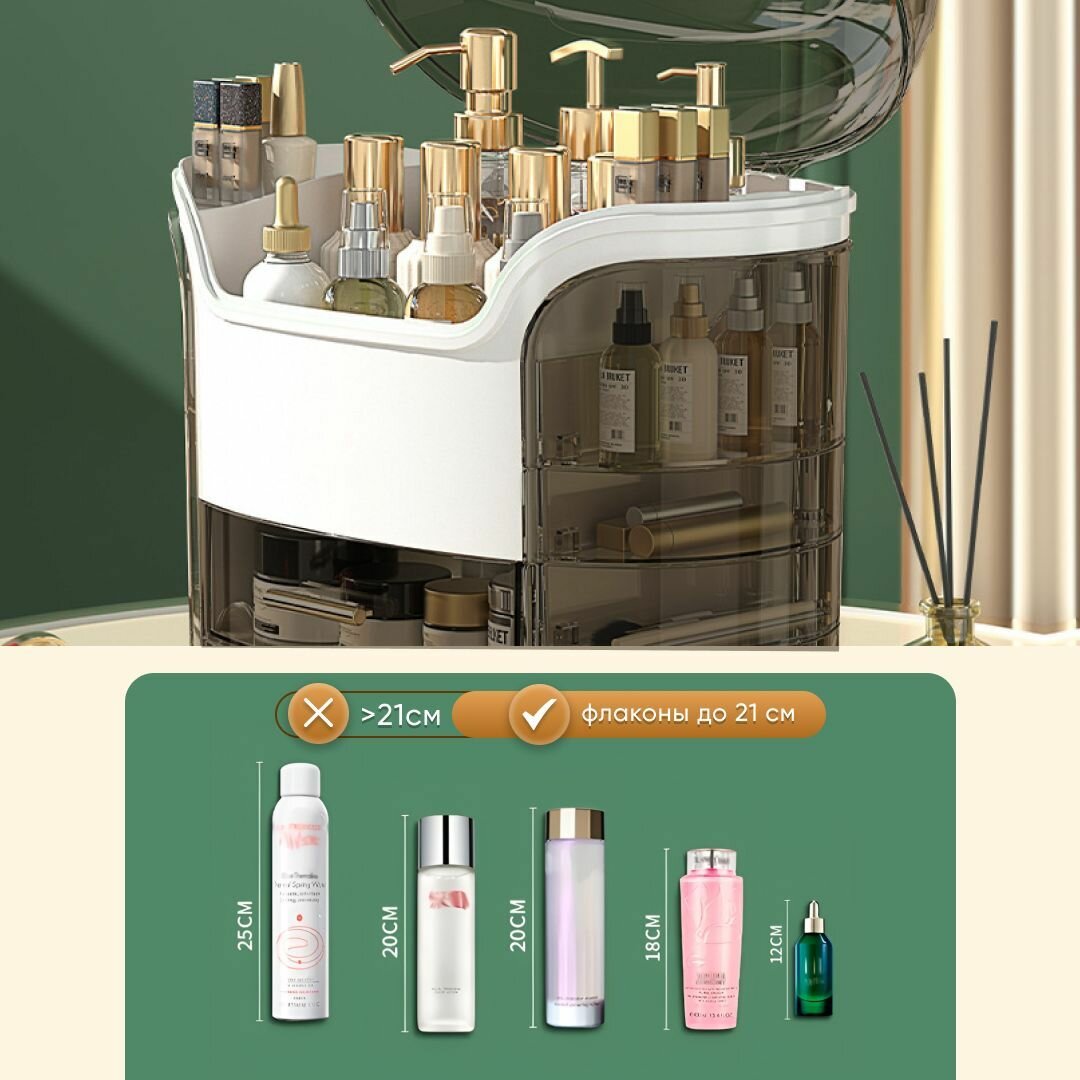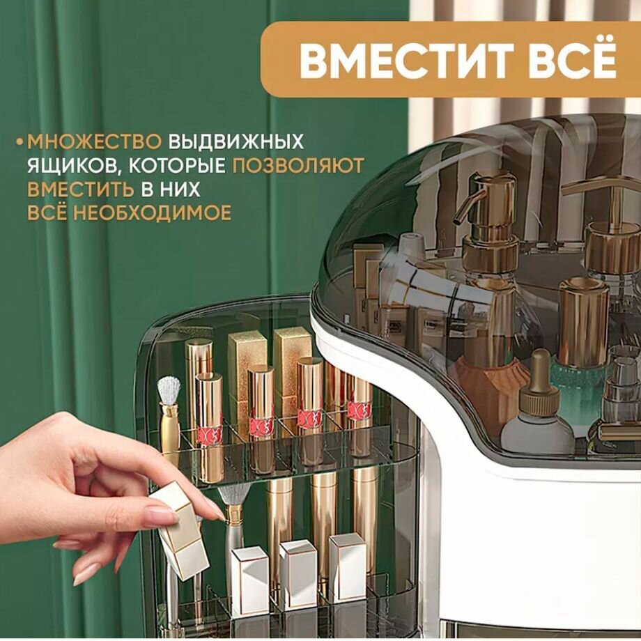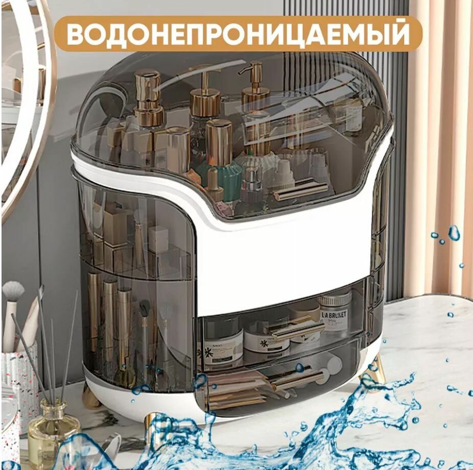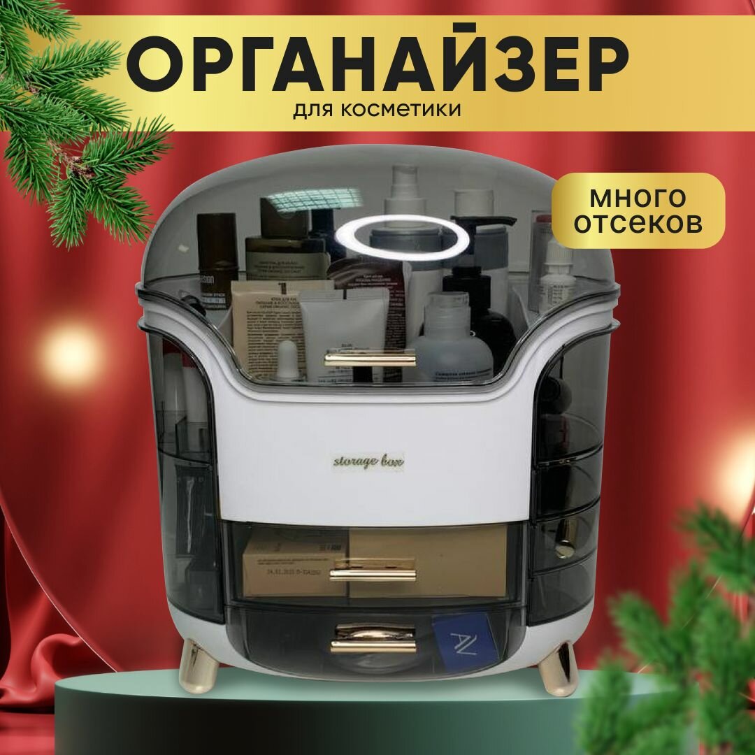 Органайзер для косметики с зеркалом OQQI, 3 секции, с выдвижным ящиком
