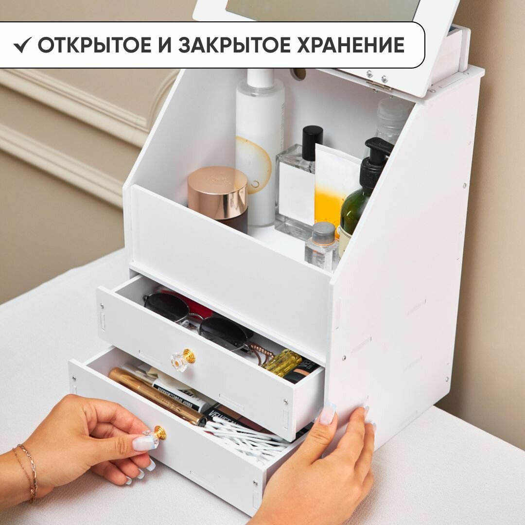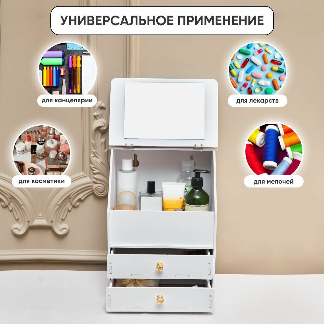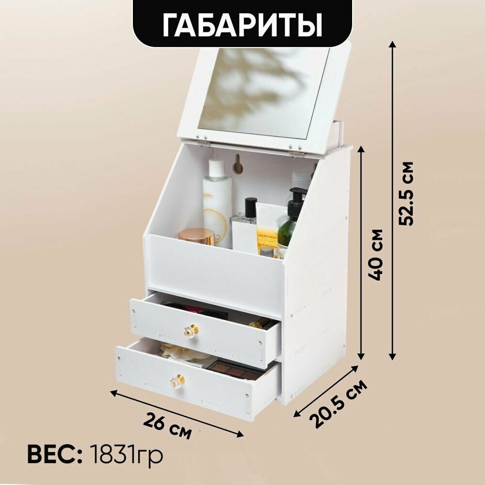 Органайзер для косметики с зеркалом Oqqi, большой, 8 секций, с выдвижными ящиками, отделение для салфеток, 20х25х40 см, белый