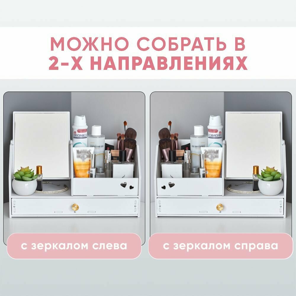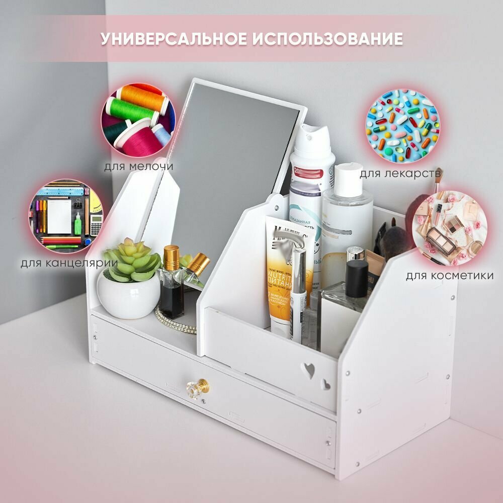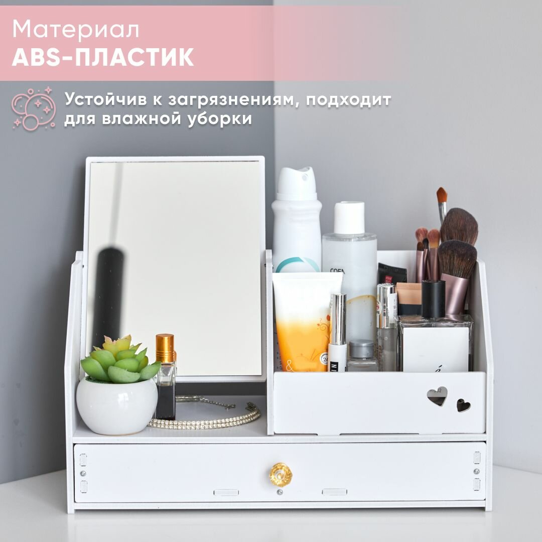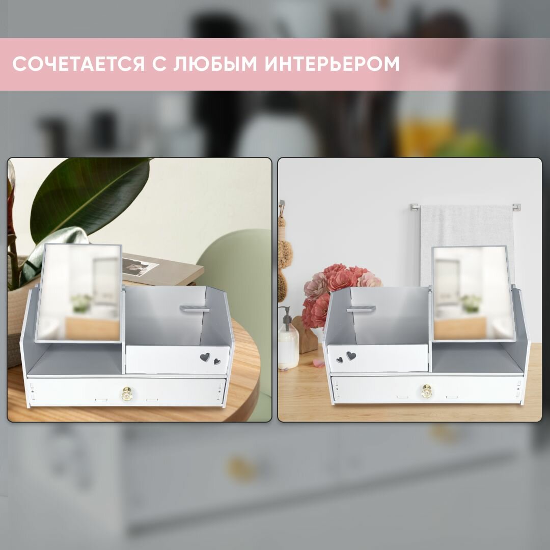 Органайзер для косметики с зеркалом OQQI, 3 секции, с выдвижным ящиком