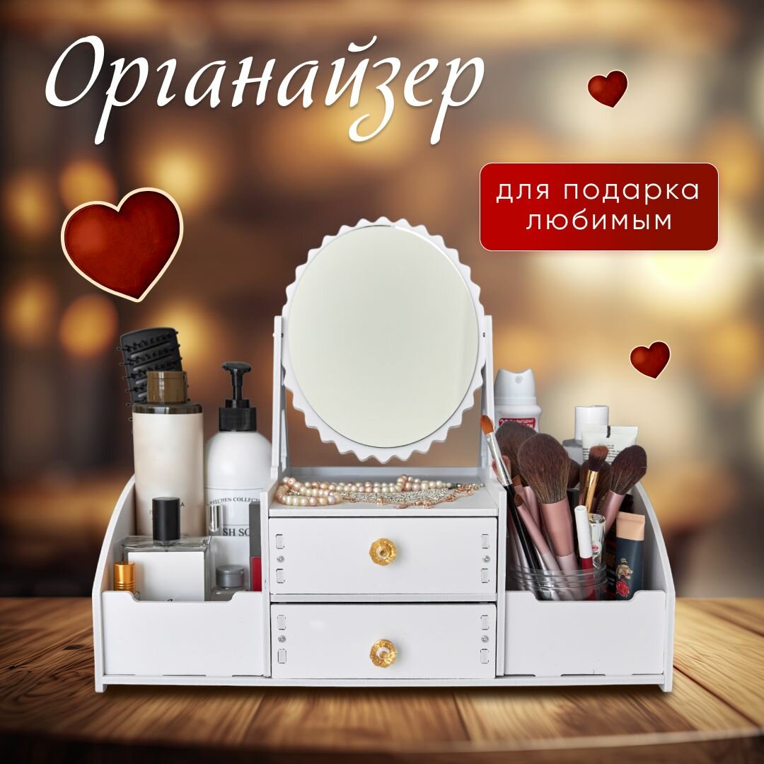 Органайзер для косметики с зеркалом OQQI, 3 секции, с выдвижным ящиком