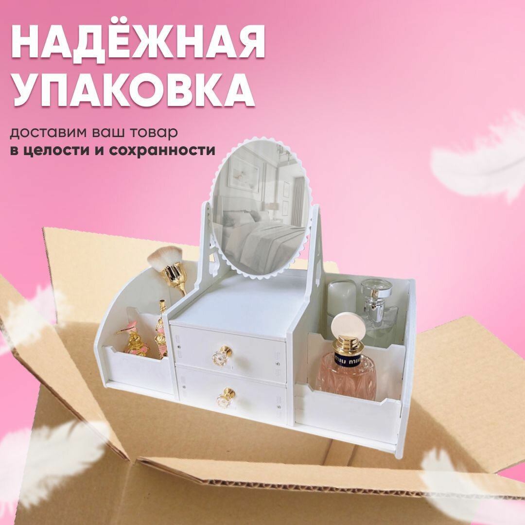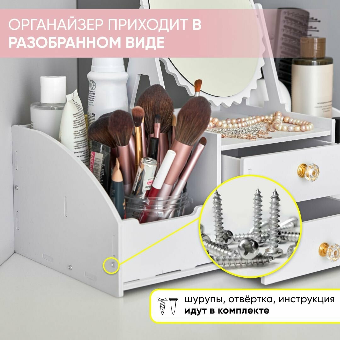 Органайзер для косметики с зеркалом Oqqi, большой, 8 секций, с выдвижными ящиками, отделение для салфеток, 20х25х40 см, белый