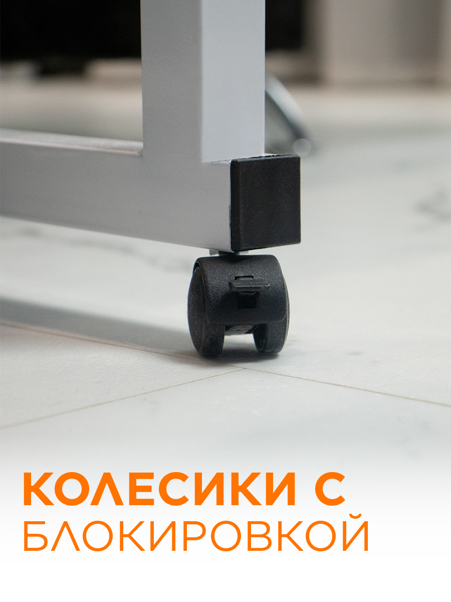| Подробная комплектация | Столешница - 1шт; Верхнее крепление - 2шт; Ножки - 2шт; Колеса - 4шт; Фиксаторы высоты - 2шт; Саморезы; Отвертка |