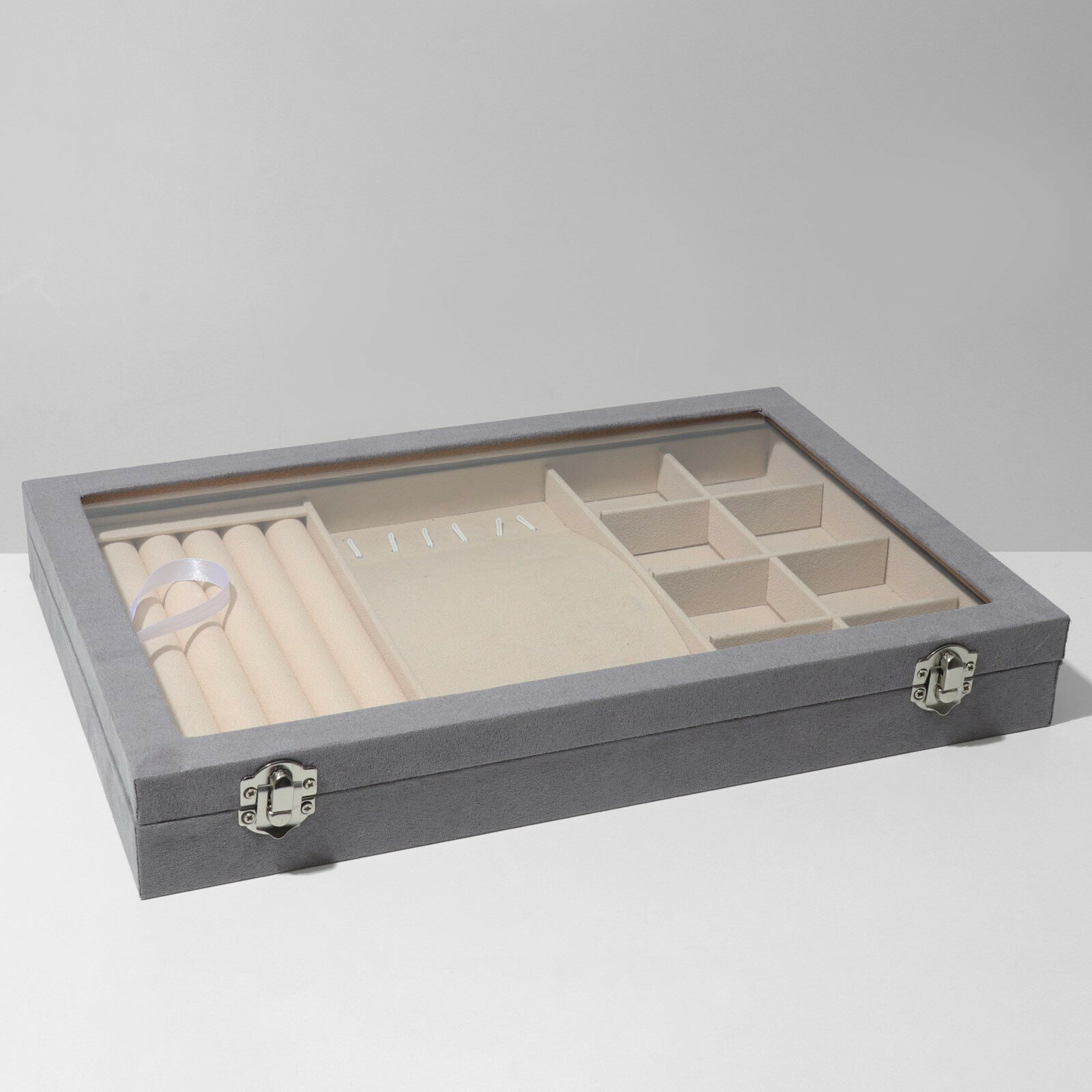 Подставка для украшений "Шкатулка" 5 рядов, 6 крюч,8 яч, флок, 35*24,5*5, цвет серо-беж 9746970