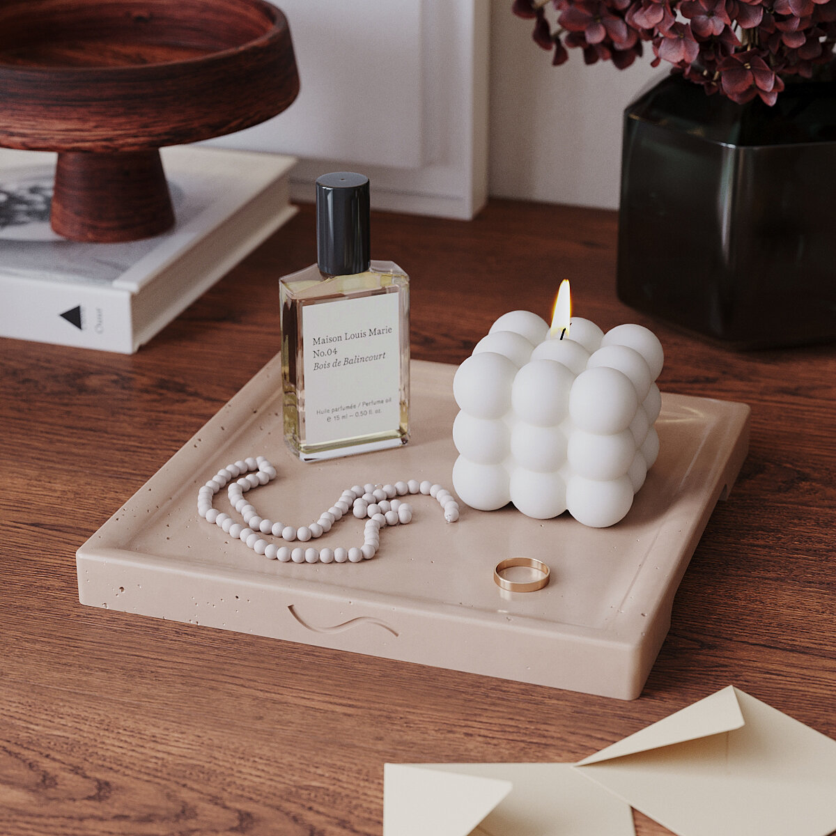 Декоративный поднос, подставка для украшений и свечей, органайзер для мелочей и косметики Dorian Square S, 20x20 см, бетон, кремовый глянцевый