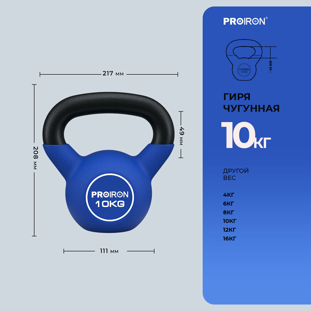 Купить Гиря 10 кг, чугунная, неопреновая, PROIRON, для фитнеса, синяя