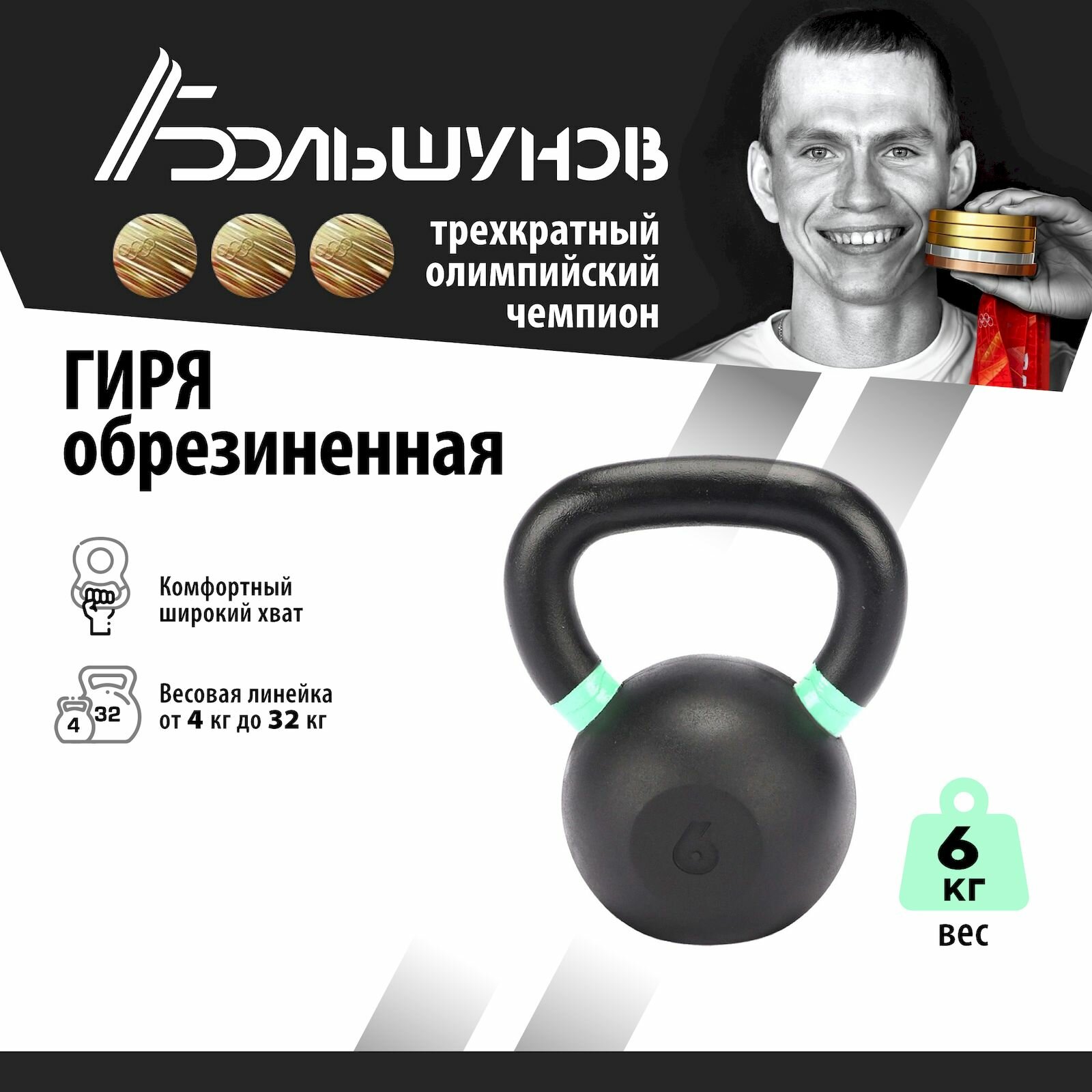 Обрезиненная гиря Александр Большунов, черная, 6кг интересное: