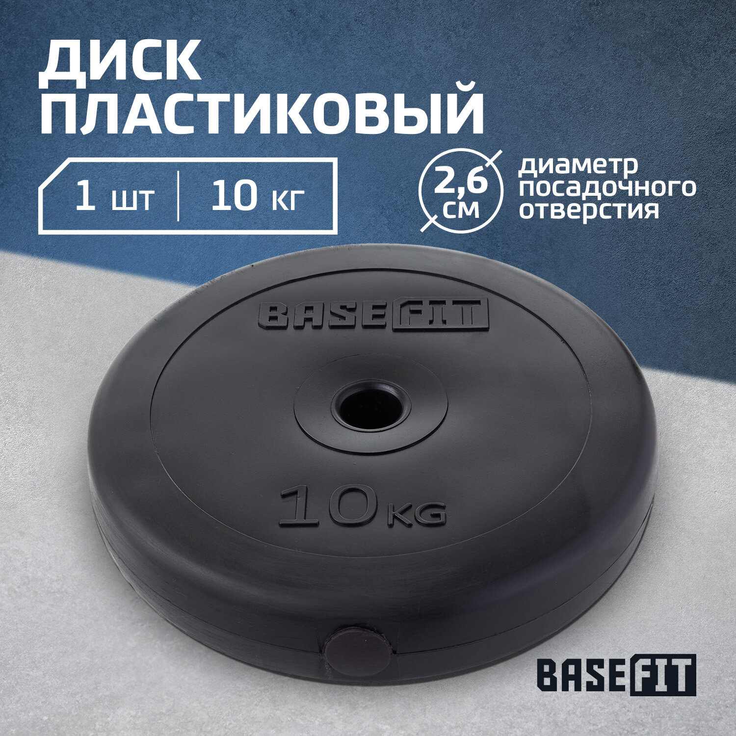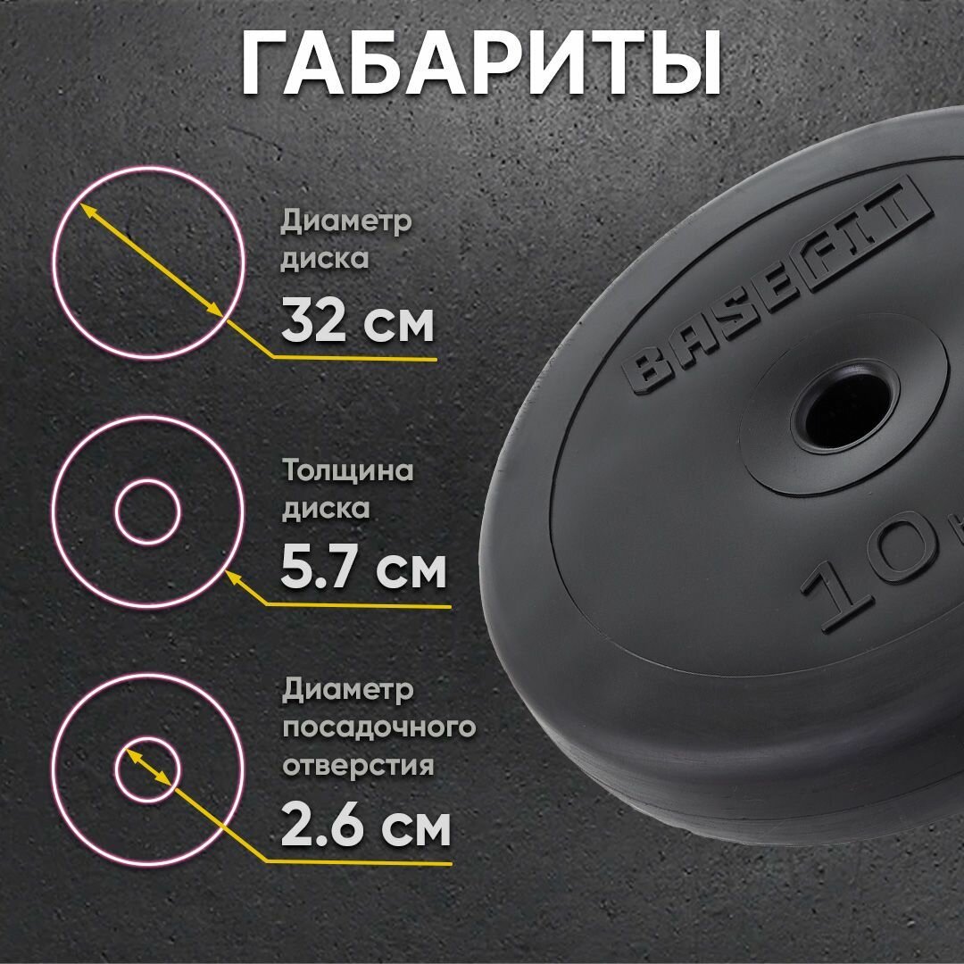 Блин для штанги пластиковый BASEFIT, вес 10 кг, d=26 мм, цвет черный