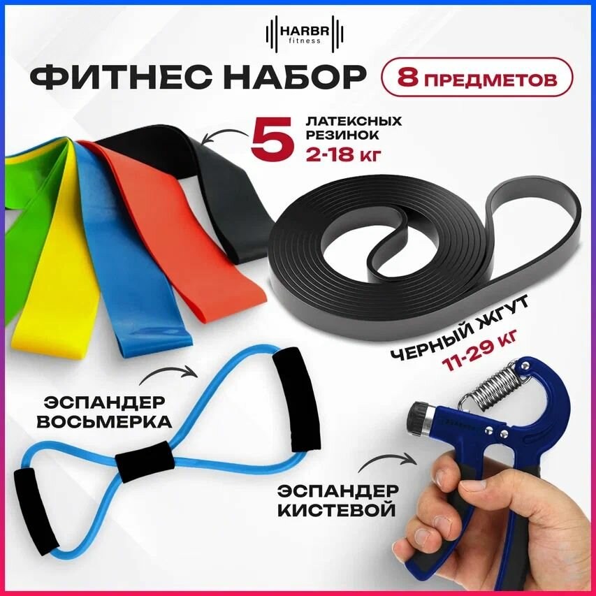 Купить Резинки для фитнеса HARBR FITNESS резина, эспандер кистевой, ленточный набор 8 шт
