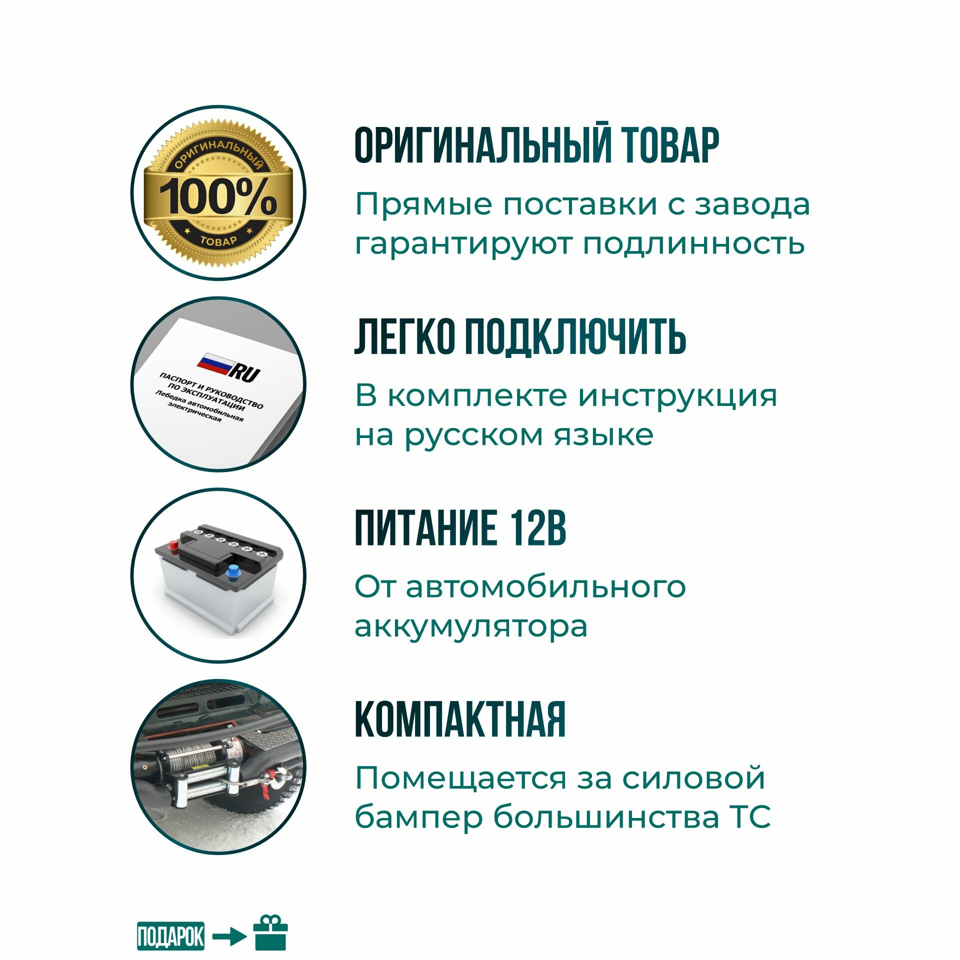 | Подробная комплектация | 1. Лебедка с кевларовым тросом 2. Блок управления лебедки. 3. Проводной пульт ( на руль) 4. Беcпроводной пульт 5. Клюз 6. Крюк 7. Лента вытягивания троса 8. Заглушки на провода (2 шт) 9. Болты крепления. 10. Площадка для крепления лебедки 11. Инструкция на русском языке |