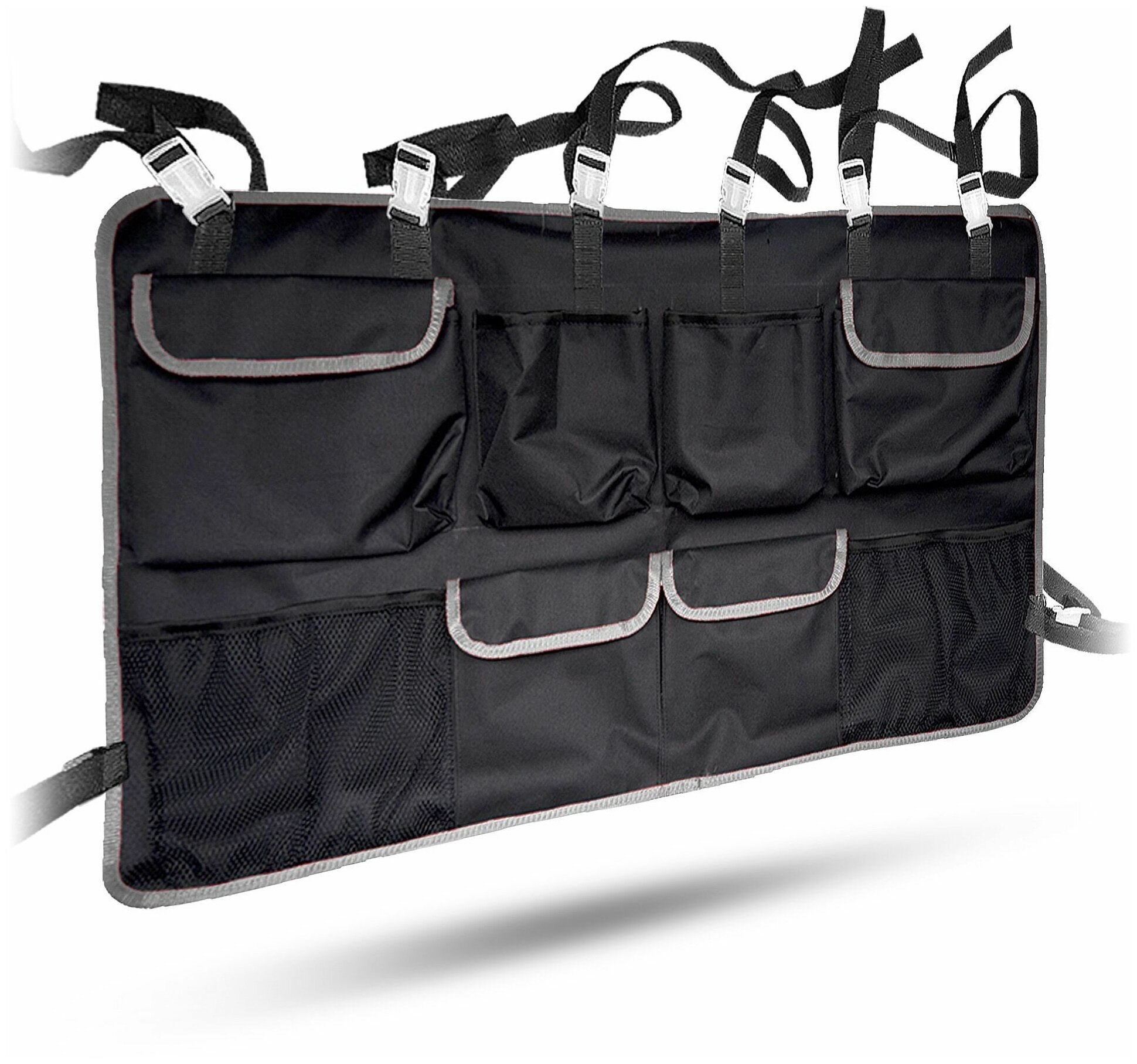 Купить Органайзер в багажник на спинку заднего сиденья для автомобиля подвесной с карманами для хранения вещей и автоаксессуаров, чёрный с серой окантовкой