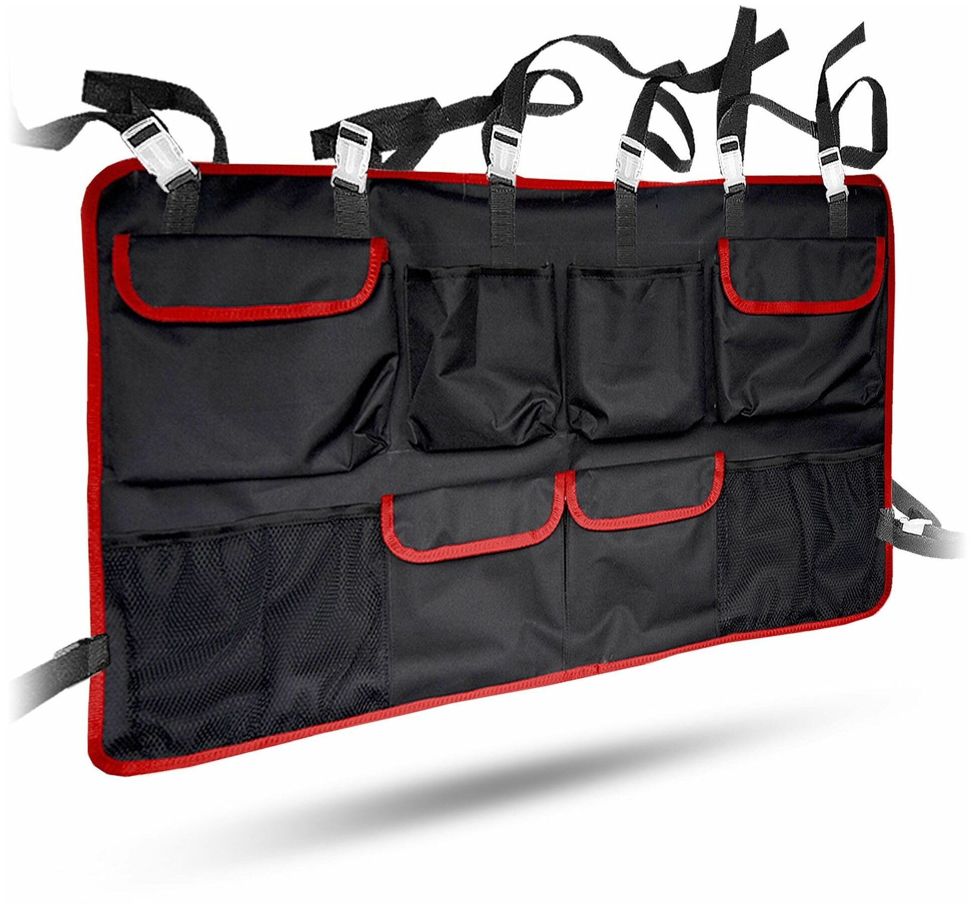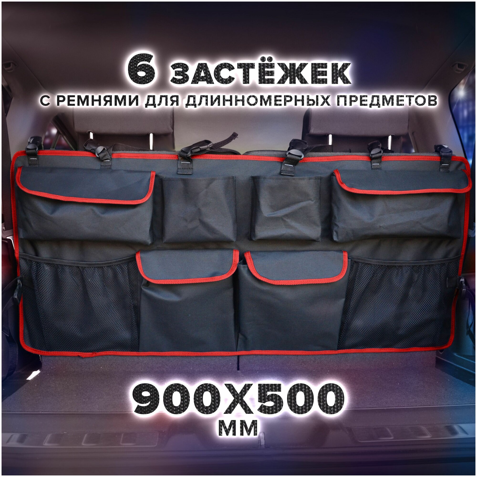 Купить Органайзер в багажник на спинку заднего сиденья для автомобиля подвесной с карманами для хранения вещей и автоаксессуаров, чёрный с красной окантовкой