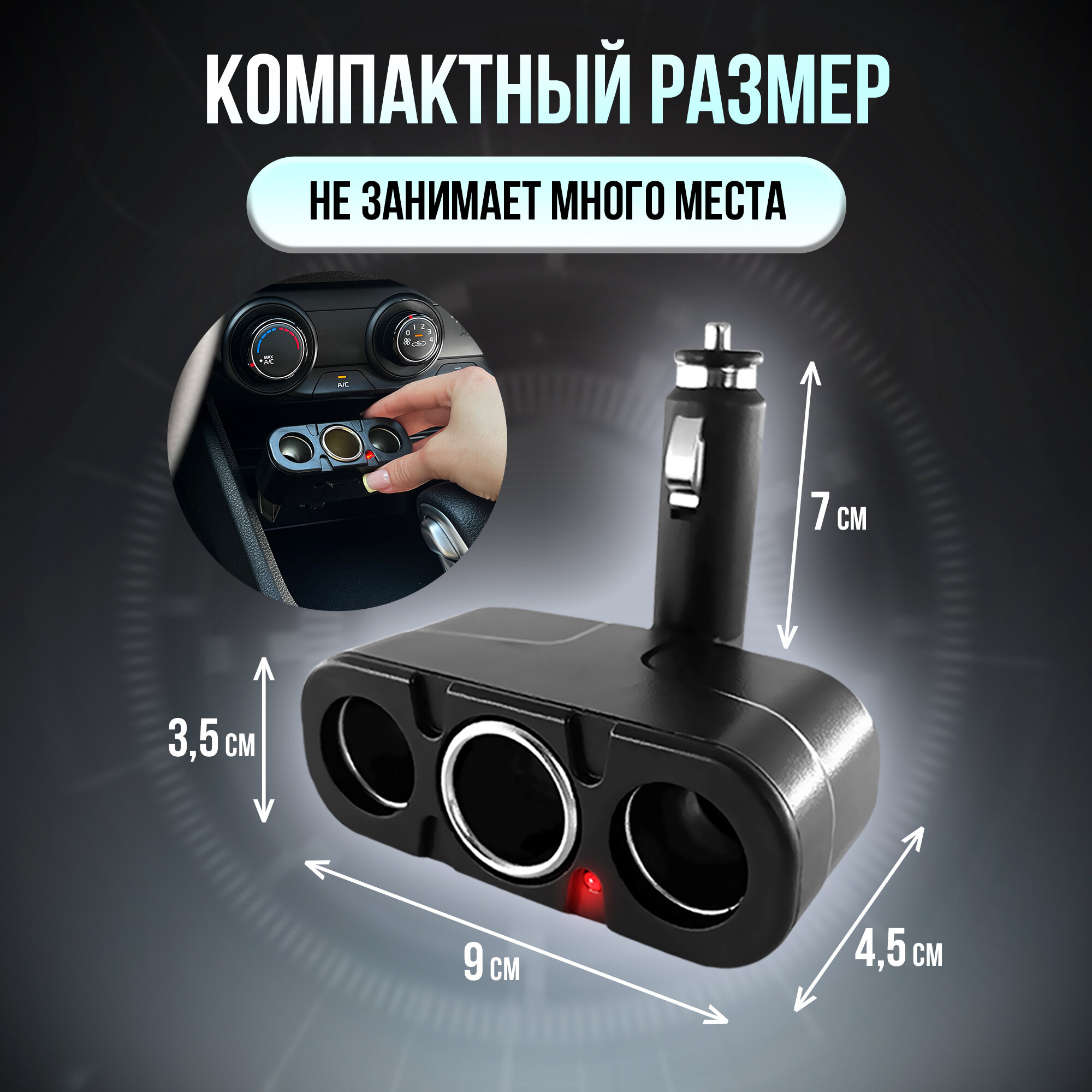 Разветвитель прикуривателя автомобильный, 100Вт, 3 разъема, индикатор, поворотная ножка, штекер прикуривателя, черный