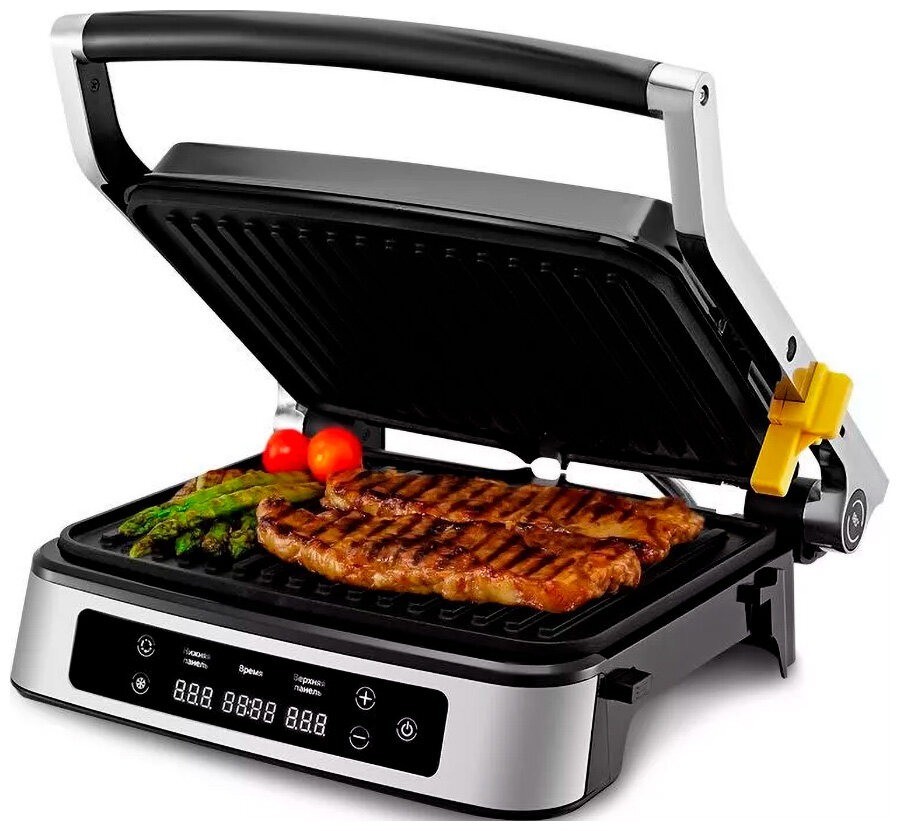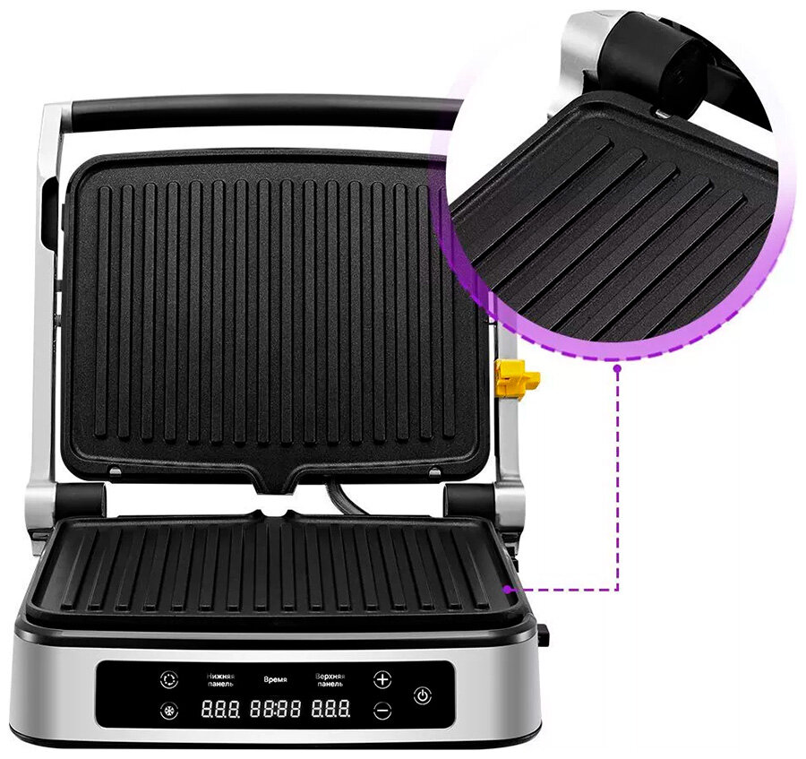 | Особенности | антипригарное покрытие / контактный гриль / поддон для сбора жира / регулировка высоты верхней панели / съемные пластины |