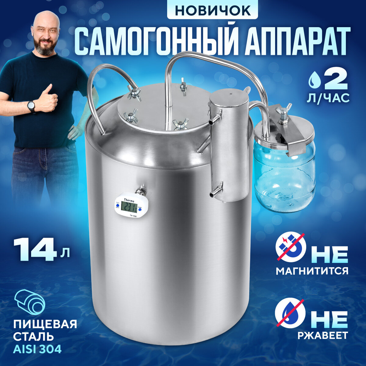 | Дополнительная информация | Самогонный аппарат Новичок 14 л с сухопарником / дистиллятор домашний для самогоноварения / Перегонный куб Новичок на 14 литров с холодильником |