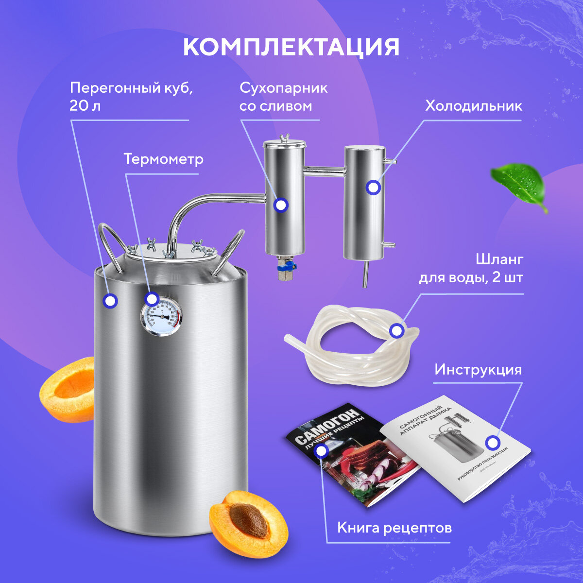 | Подробная комплектация | Перегонный куб на 20 литров - 1 шт, сухопарник со сливом- 1 шт, холодильник- 1 шт, биметаллический термометр- 1 шт, шланги для подведения воды, спиртомер- 1 шт, книга рецептов - 1 шт, инструкция - 1шт . |