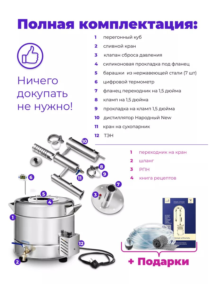 | Подробная комплектация | перегонный куб, силиконовая прокладка, барашки из нержавеющей стали - 6 шт, гермоввод, клапан сброса давления, цифровой термометр, джин-корзина, холодильник, шланг ПВХ- 4м, спиртометр, хомут 1,5 дюйма - 1 шт, хомут 2 дюйма - 1 шт, прокладка под кламп силиконовая - 2 шт, книга рецептов |
