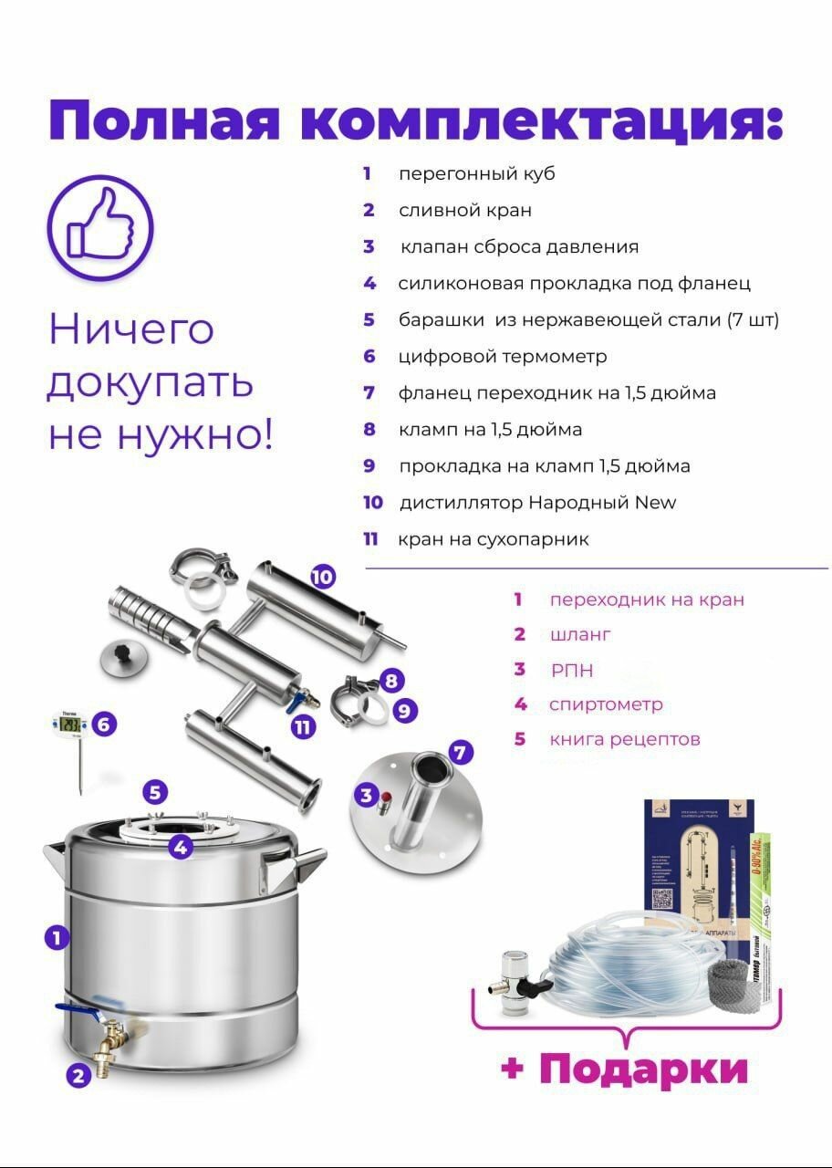 | Подробная комплектация | перегонный куб, силиконовая прокладка, барашки из нержавеющей стали - 6 шт, гермоввод, клапан сброса давления, цифровой термометр, джин-корзина, холодильник, шланг ПВХ- 4м, спиртометр, хомут 1,5 дюйма - 1 шт, хомут 2 дюйма - 1 шт, прокладка под кламп силиконовая - 2 шт, книга рецептов |