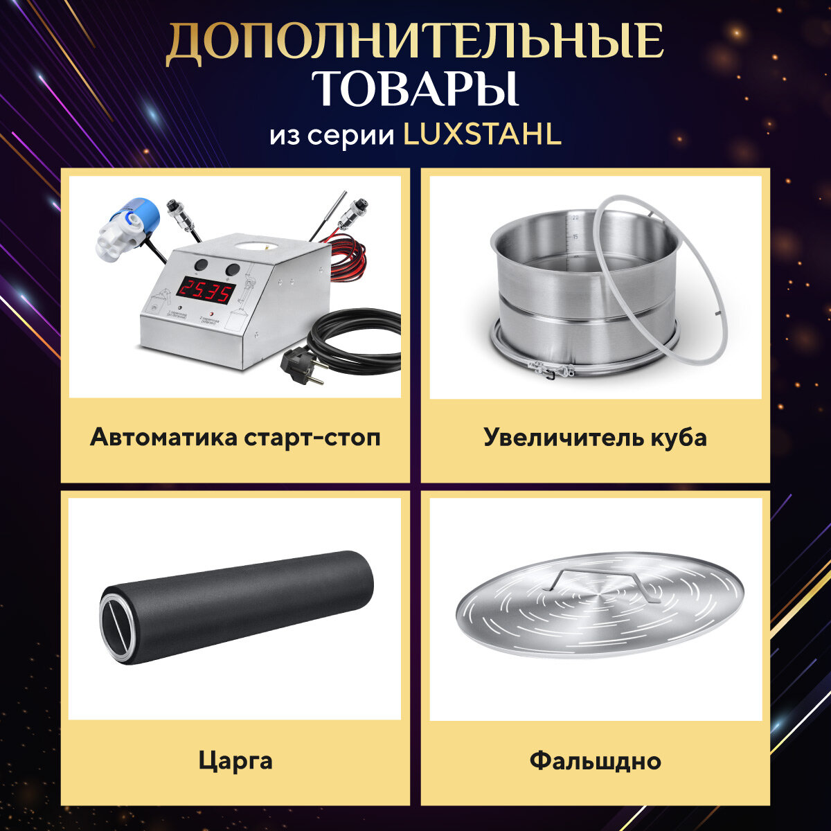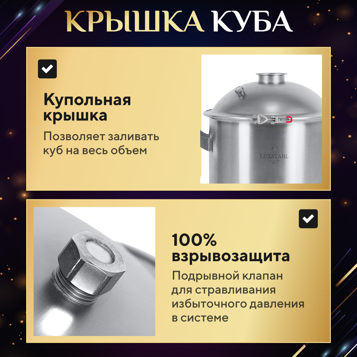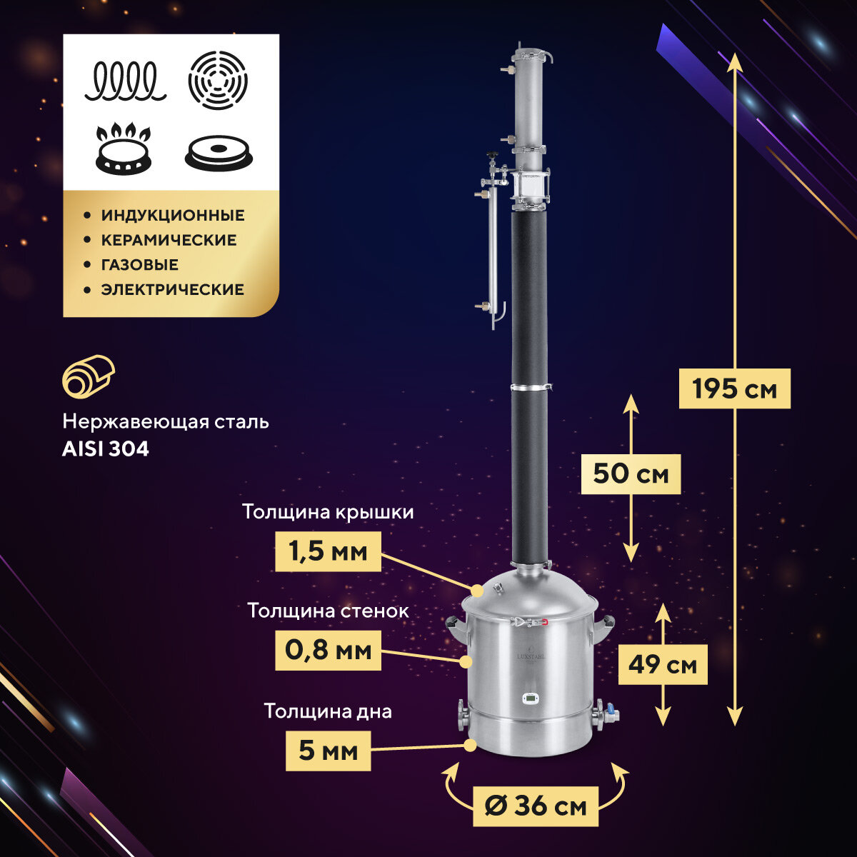| Дополнительная информация | Самогонный аппарат LUXSTAHL колонного типа 3 дюйма. Дистиллятор Люкссталь 37 литров с узлом отбора. Толщина купольной крышки 1,5 мм; толщина дна - 5 мм |