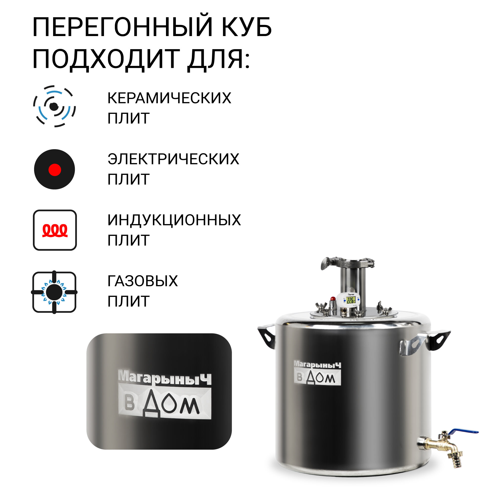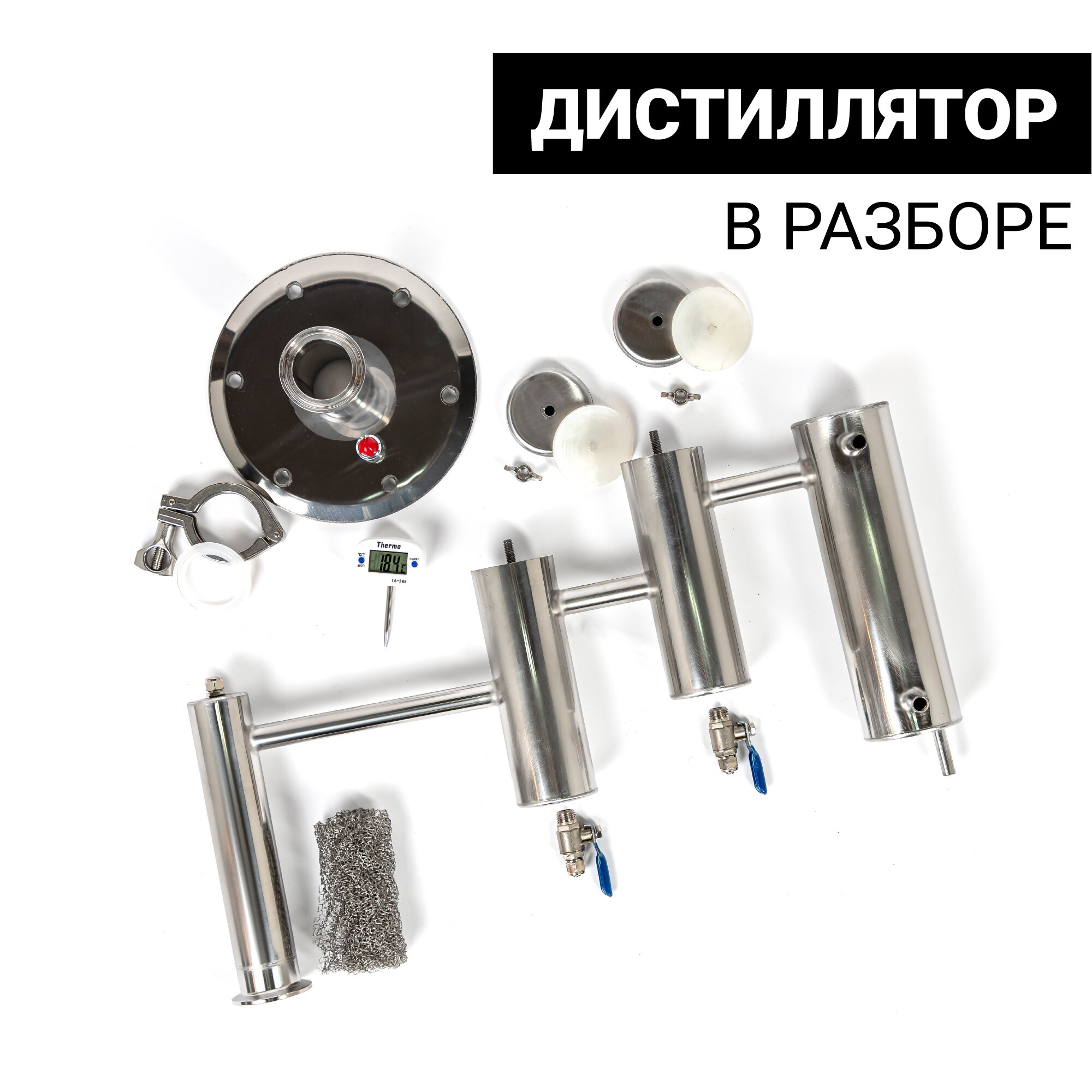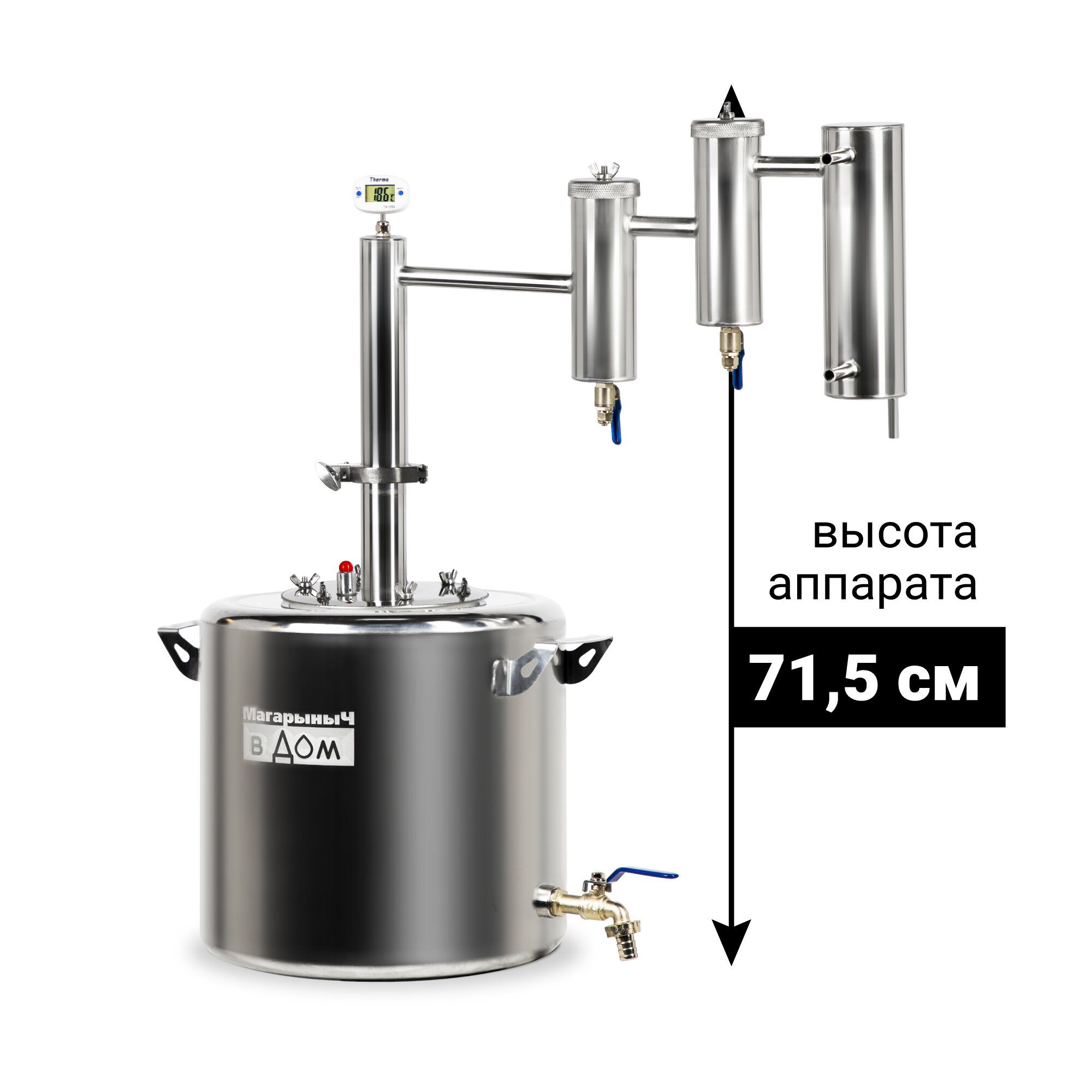 | Подробная комплектация | Сливной кран - 1 шт Силиконовая прокладка под фланец - 1 шт; Барашки из нержавеющей стали - 6 шт Хомут 1.5 дюйма - 1 шт Прокладка под кламп 1.5 дюйма - 1 шт; Цифровой термометр - 1 шт Фланец-переходник 10 см - 1 шт; Дистиллятор Магарыч - 1 шт Кран для сухопарника - 2 шт; Перегонный куб - 1 шт Клапан сброса давления - 1 шт |