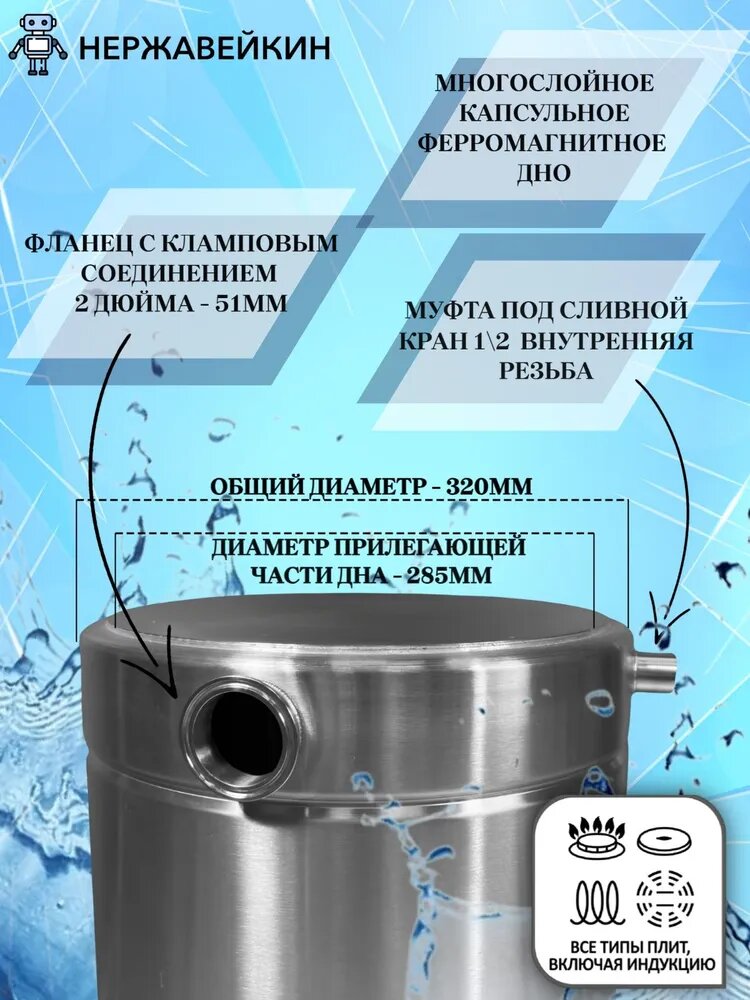 Перегонный куб люкс 36 литров, 32х45 см, нержавеющая сталь 304 AISI, кламп под ТЭН, выход в крышке 2 дюйма интересное: