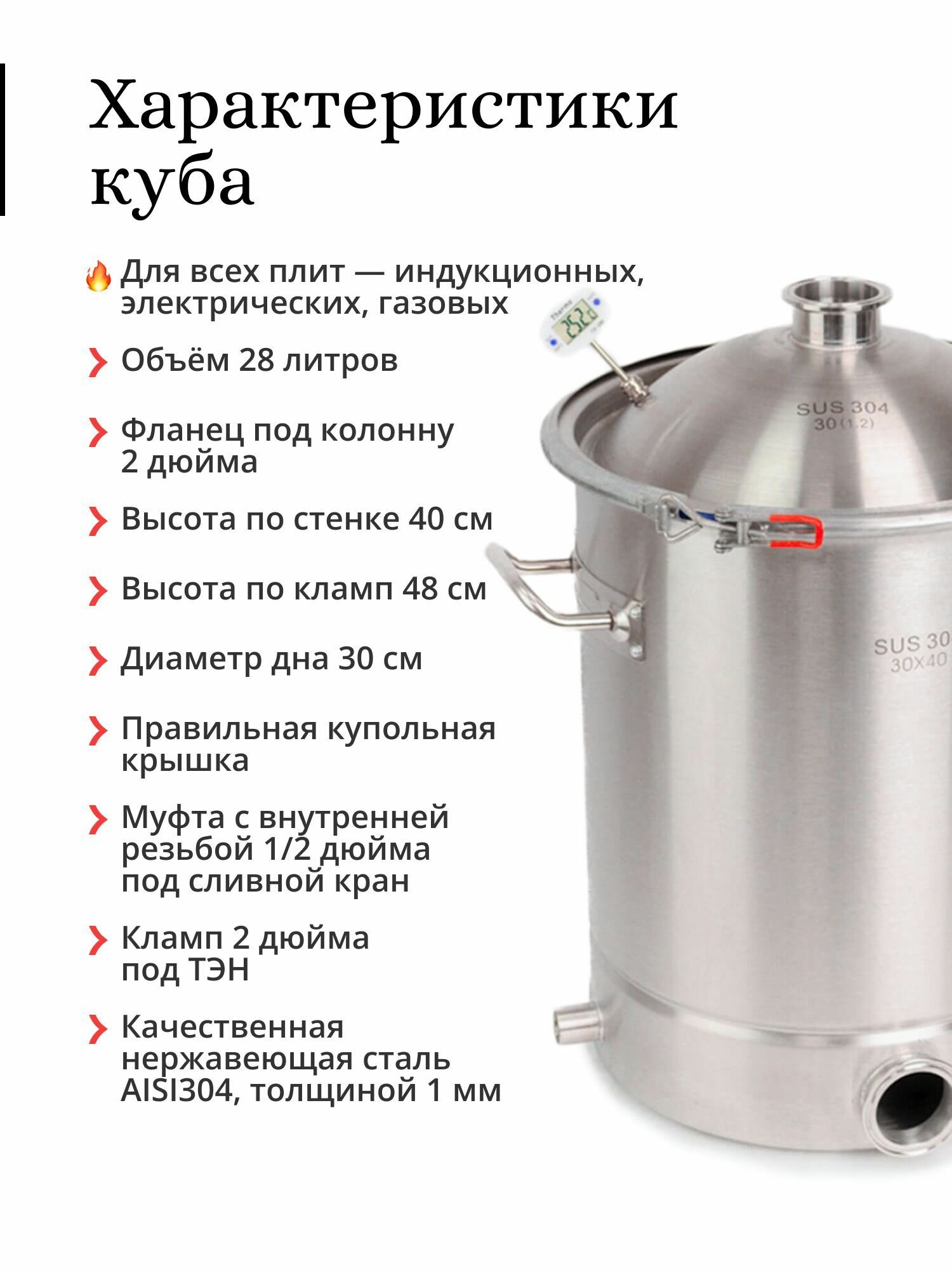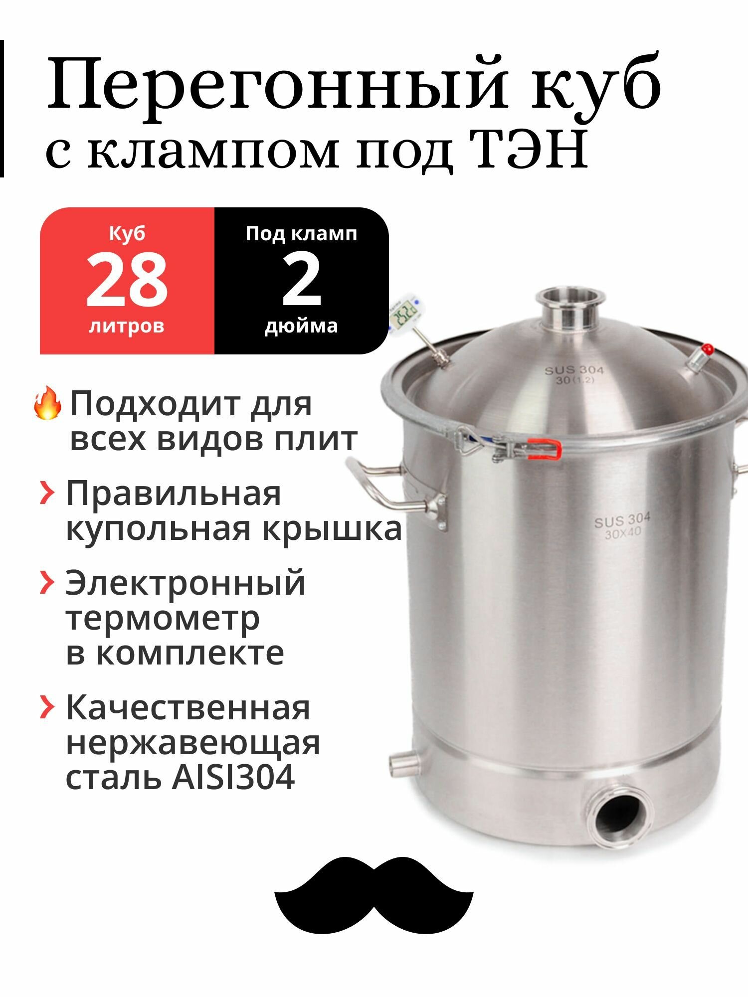 Перегонный куб 28 литров, 30х40 см, 304-я сталь, кламп под ТЭН, под колонну 2 дюйма интересное: