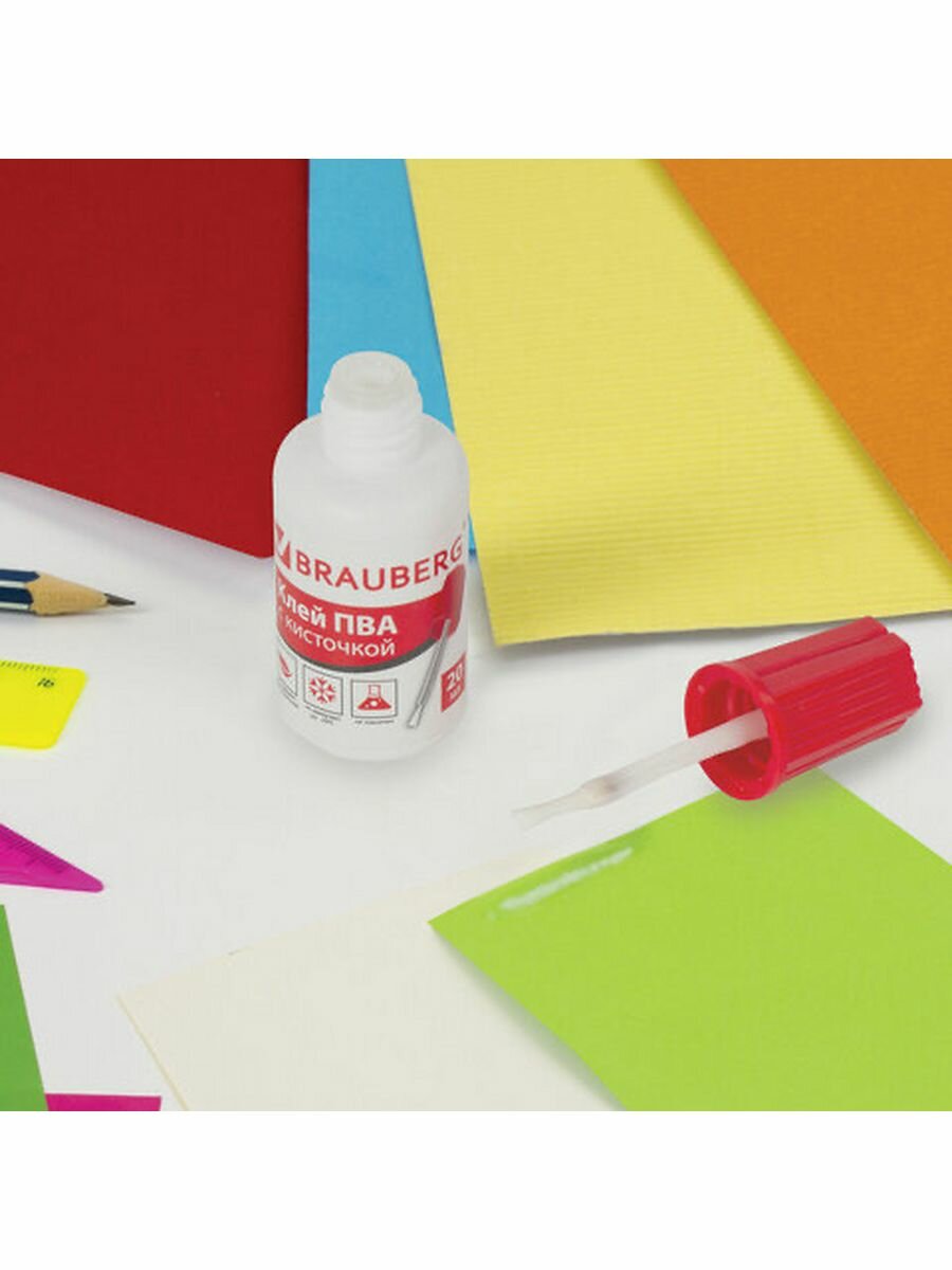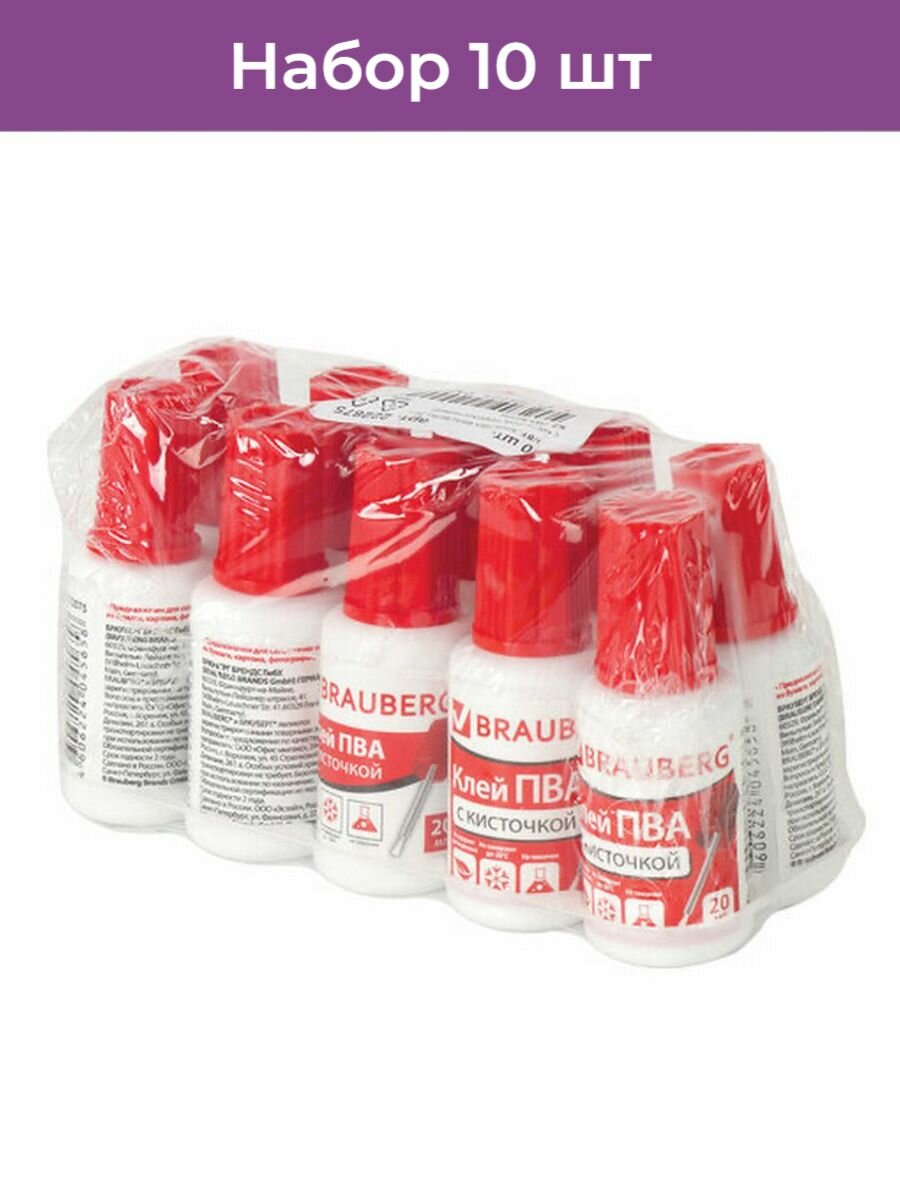Клей ПВА Brauberg канцелярский, с кисточкой, для бумаги, картона, ткани, 20 мл, 10 шт.