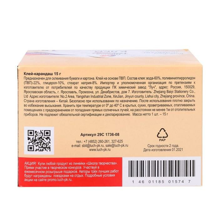 Клей-карандаш PVP 15 г Луч "Школа творчества" интересное: