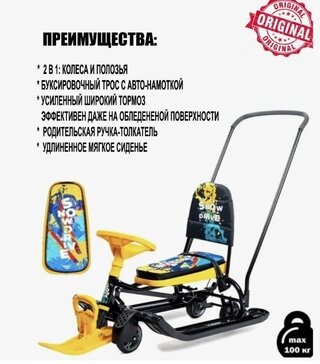| Особенности | амортизация, буксировочный трос, для взрослых, колеса, мягкое сиденье, поворотный руль, ремень безопасности, ручка-толкатель, складная конструкция, складная спинка, со спинкой, тормоз, трос с автоматическим скручиванием |